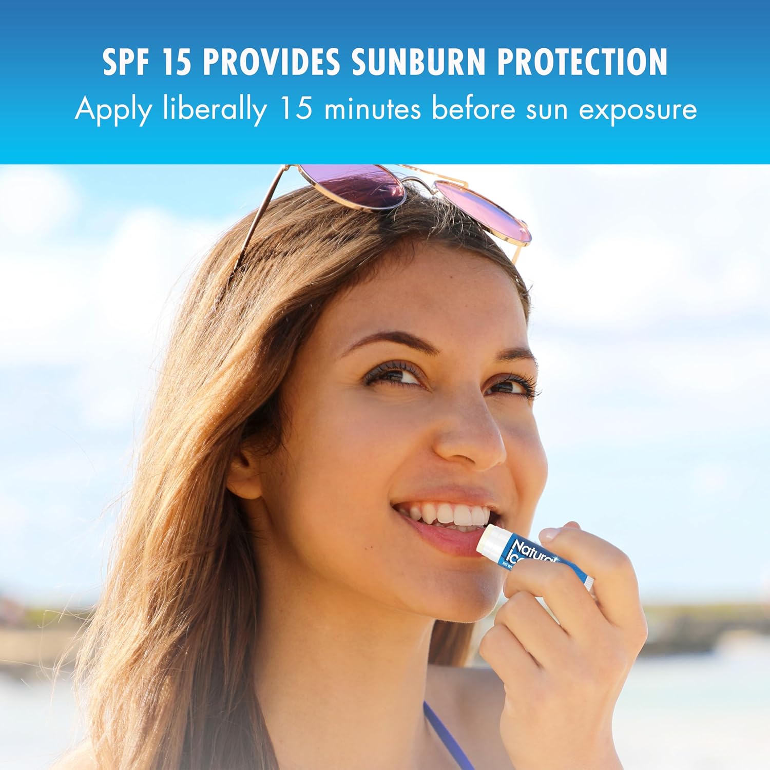 - SPF PROTECTION: Safeguard your lips from the sun's harmful rays with built-in SPF 15. Apply liberally 15 minutes before sun exposure and reapply every two hours (use as directed); Natural Ice Lip Balm is for men, women, and children over 6 months of age