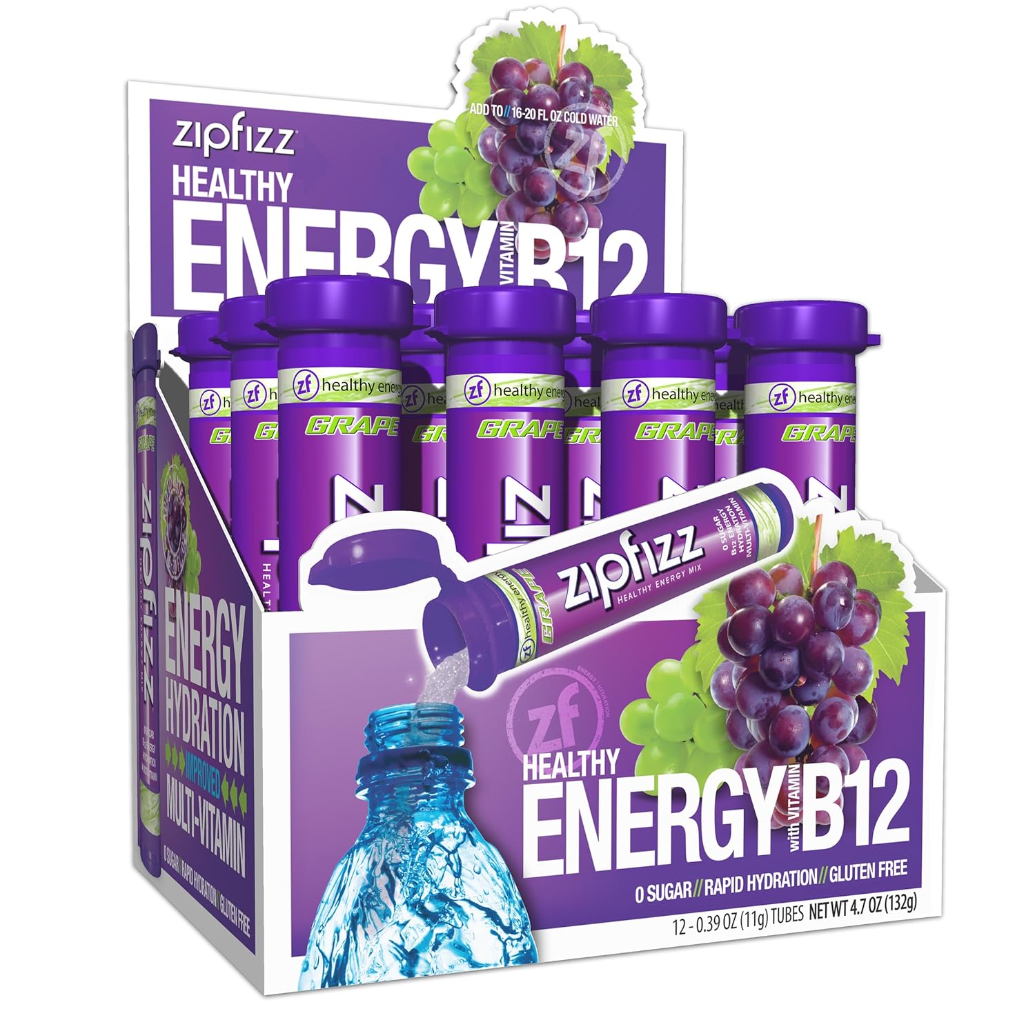 Zipfizz Daily Energy Drink Powder, Grape, 12 Pack | 3-in-1 Sustained Energy, Rapid Hydration, and Essential Vitamins | Sugar-Free | Electrolyte Powder | Contains Vitamin B-12 & Antioxidants