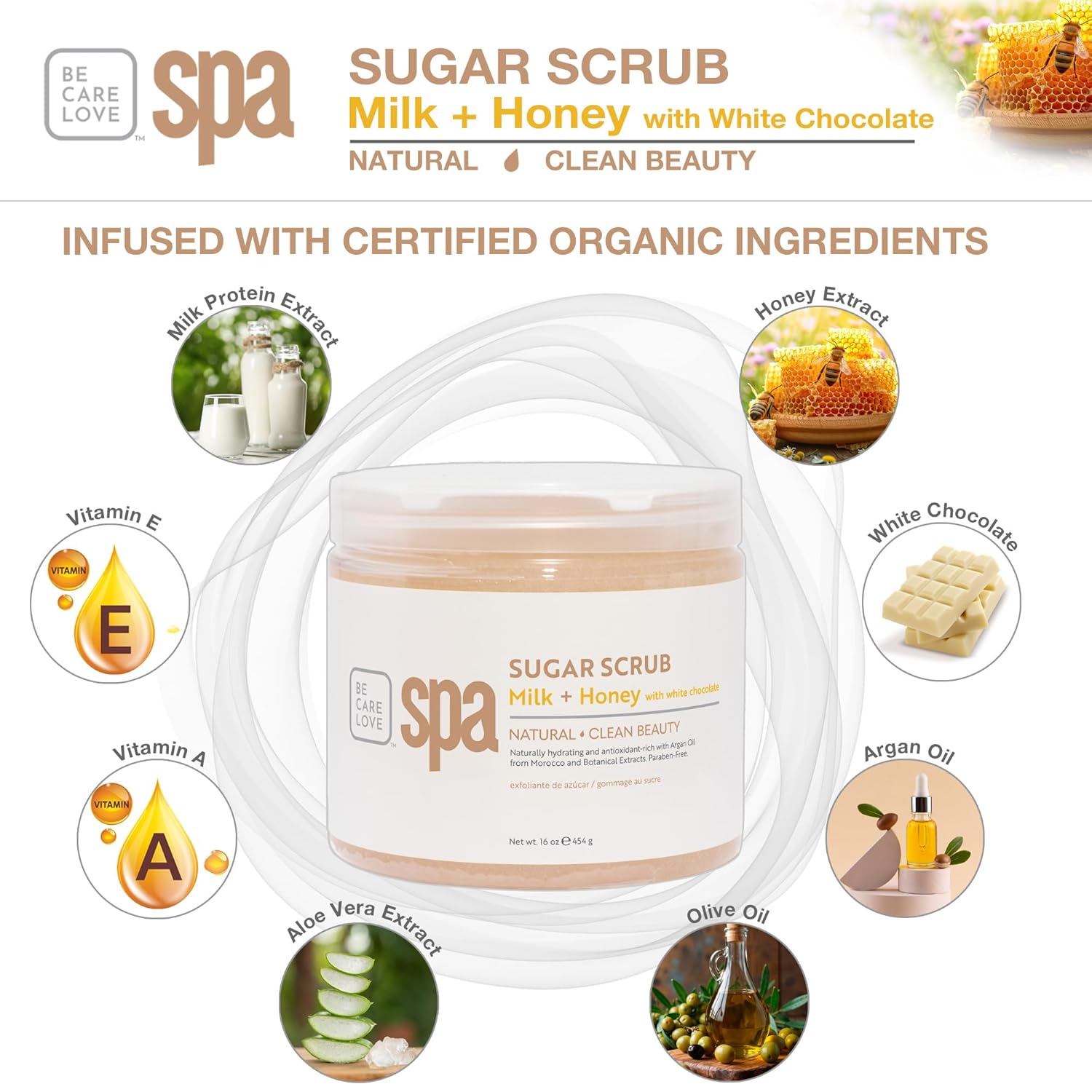 BCL SPA sugar scrub | organic Milk and Honey with White Chocolate exfoliating body scrub removes dead, dry skin for a soft & hydrated feel, nourishing essential body care 16 oz