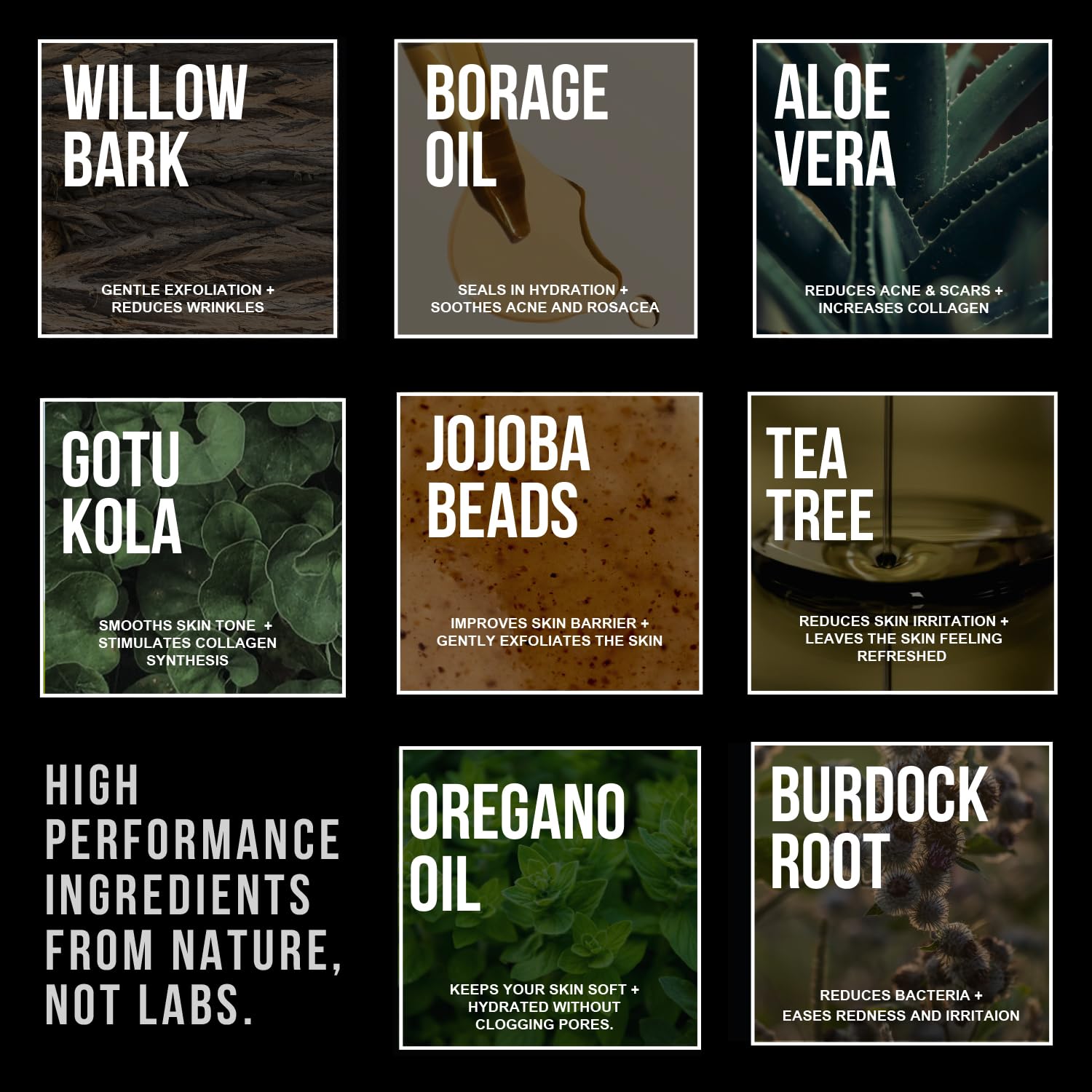 - π΄ CLEAN INGREDIENTS: Packed with potent natural ingredients including Organic Aloe Vera, Organic Rosehip, Tea Tree Oil, Organic Jojoba and Burdock Root. Our men's face wash revitalizes and promotes cell turnover to defend against signs of aging. Rest assured, it's cruelty-free and formulated to fuel your skin without harmful chemicals.