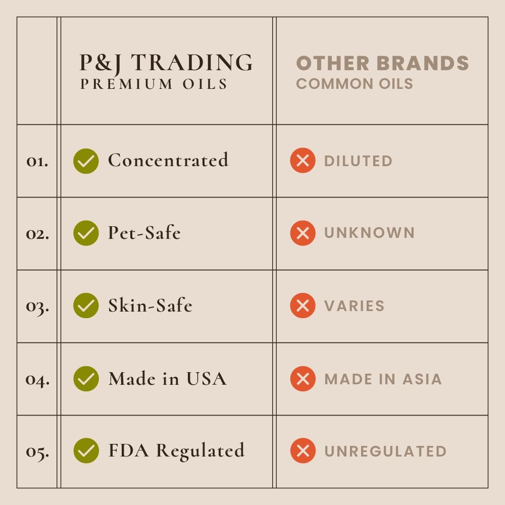 - PREMIUM GRADE: P&J fragrances oils are highly concentrated with a strong scent. With more than 30 years in the industry, these enhanced formulations were developed by our IFRA certified master perfumers. Our oils are safe and ideal for every home.