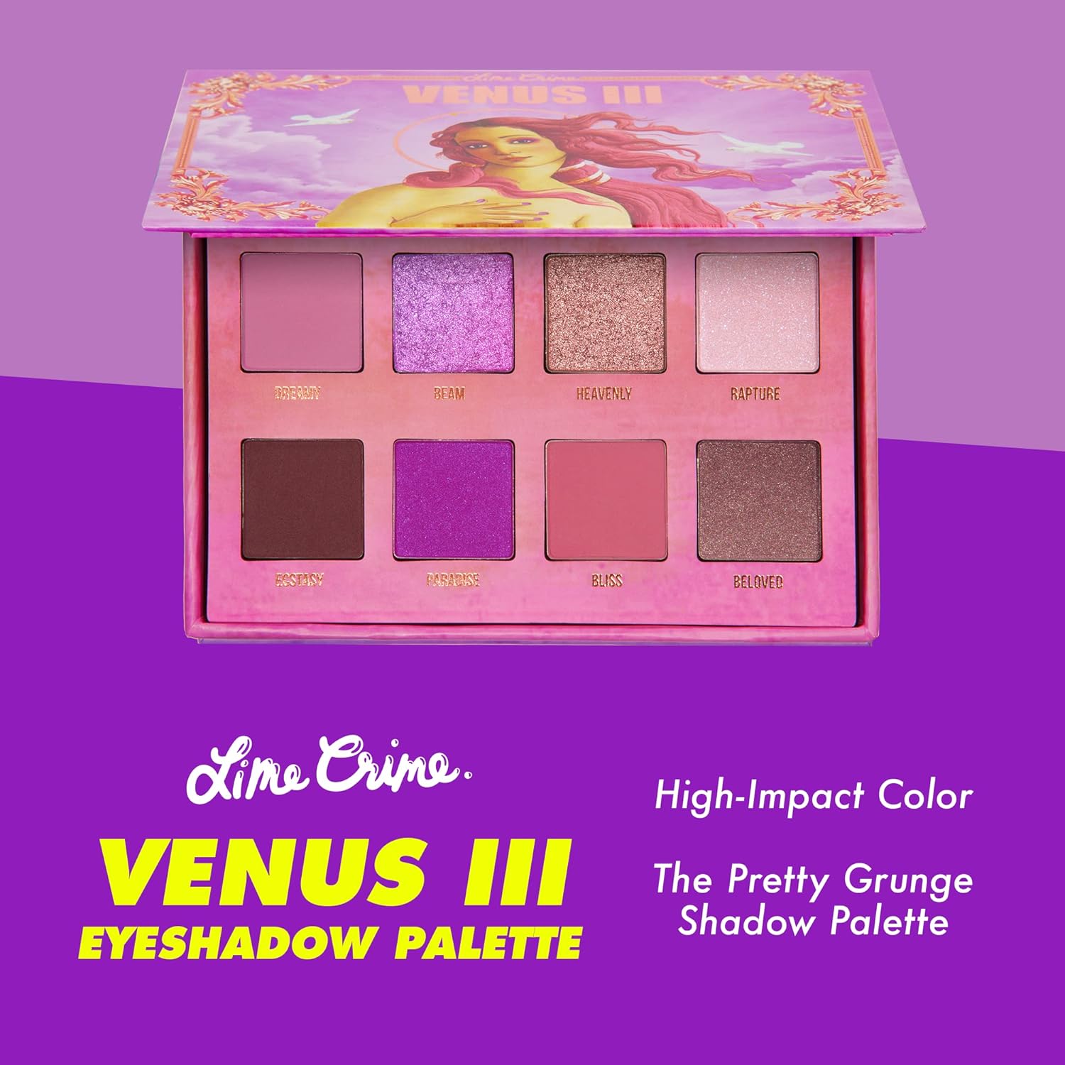 - Venus III Eye & Face Palette: Lime Crime’s Venus III is the heavenly sister of the grunge shadow palette! Happy pops of purple and pink put the crowning touch on the perfect light-to-mid tone range to flatter all skin tones. This palette includes 8 shades and 5 different finishes, all formulated to have 1-swipe coverage.