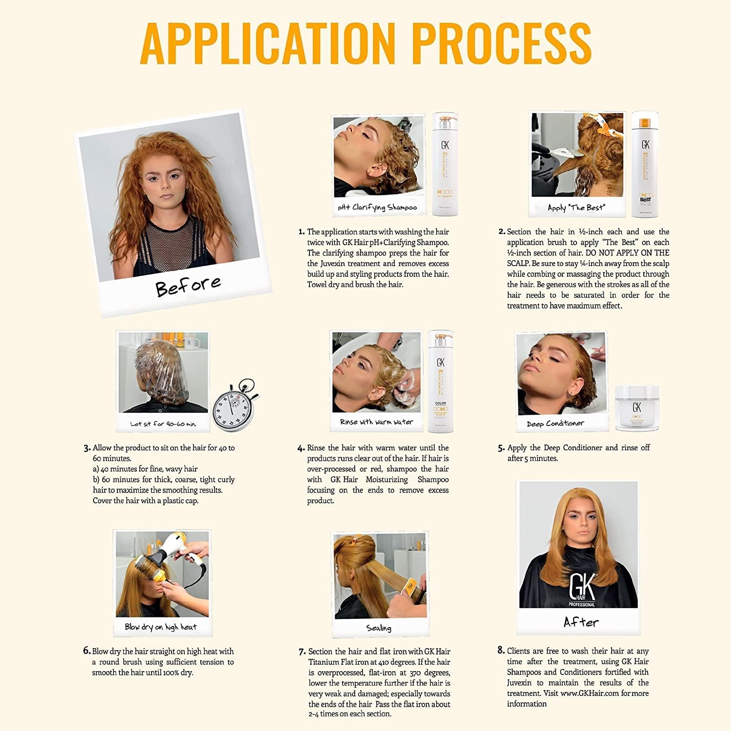 • NO WAITING TIME TO WASH AS NORMAL: There is no wait days after the application to be allowed to wash your hair again. This GK Hair Keratin treatment The Best kit also known as Brazilian keratin treatment comes with 100ml/3.4oz Ph+ Clarifying shampoo, GK Hair The Best Keratin Treatment, GK Hair Moisturizing Shampoo, GK Hair Moisturizing Conditioner and Deep Conditioner 20ml sachet Stop buying Frizz products that work for one day.