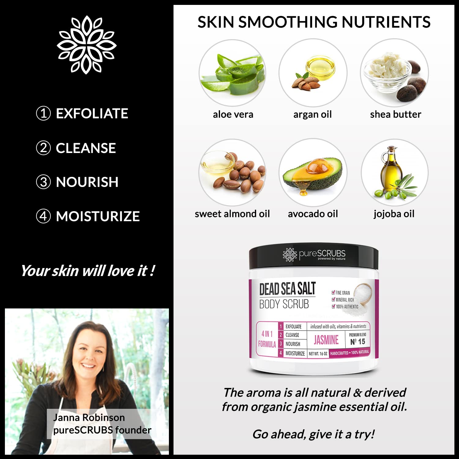 - GET ULTRA SMOOTH SKIN FAST - THIS WORKS! Our unique “4 in 1 Formula” does everything a body scrub should do and more - EXFOLIATE, CLEANSE, NOURISH & MOISTURIZE. Fine grain dead sea salt infused with essential oils, nutrients and skin softeners helps to smooth away rough, bumpy, and uneven textures to instantly reveal your true soft, healthy and radiant skin. You'll love the jasmine aroma!