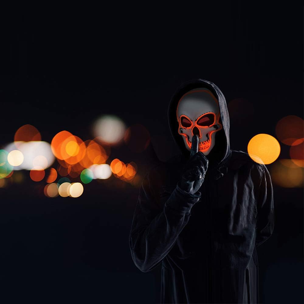 - 【Halloween Any Party Occasions】A scary face and pose will let you get more candy on halloween.EASY TO USE BY TURN ON LIGHT(YOU NEED EXTRA BUY BATTERY,IT NOT INCLUDE)The Mask Can be used on many occasions, such as Party, Rave Parties, Discos, Clubs, Halloween,Birthday, Festivals and other Events.