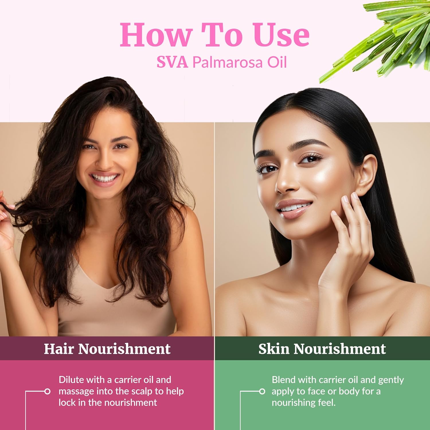 - Hair Care: SVA Palmarosa Oil is suitable for massage on hair and scalp. Always dilute with suitable carrier oil before use since it is highly concentrated. Dilute a few drops of the oil with a carrier oil for massage on the scalp for hair care. You may also use Palmarosa oil for scalp and hair by mixing a few drops of the oil with your shampoo, conditioner, and mask