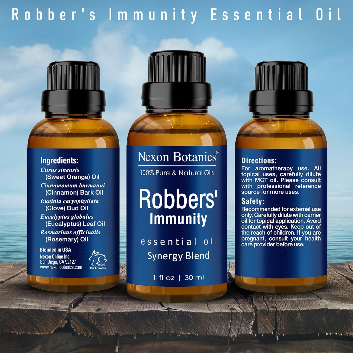 - Nexon Botanics Robbers' Immunity Essential Oil Blend consists of a proprietary combination of five pure, natural, therapeutic-grade essential oils. Cinnamon, Clove, Eucalyptus, Rosemary, and Orange oils.