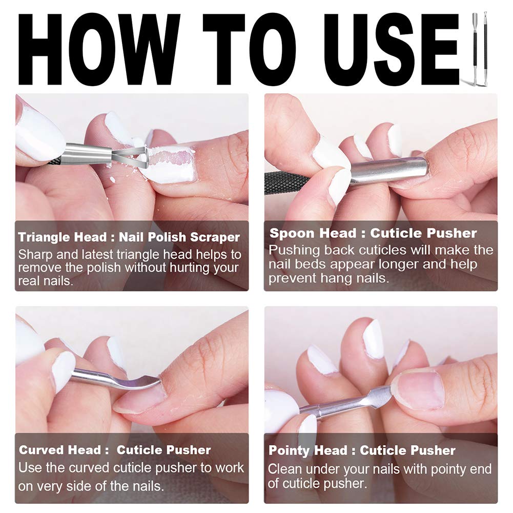 - FOUR WELL-DESIGNED HEADS: The spoon head is curved ergonomically with thicker slope, which avoids causing injury when pushing the cuticle. The triangular tip is made with thin and sharp edge, which can remove the gel polish cuticle easily and thoroughly with less scraping on nail bed. The curved-blade head is a good helper to clean up the residue along the cuticle line. The pointy head helps to remove the dead skin under your nails