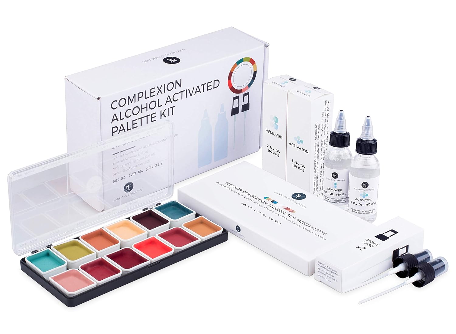 - KIT INCLUDES: 12-Color Complexion Alcohol-Activated Palette, Activator (2 fl. oz.), Remover (2 fl. oz.), 2 spray caps.