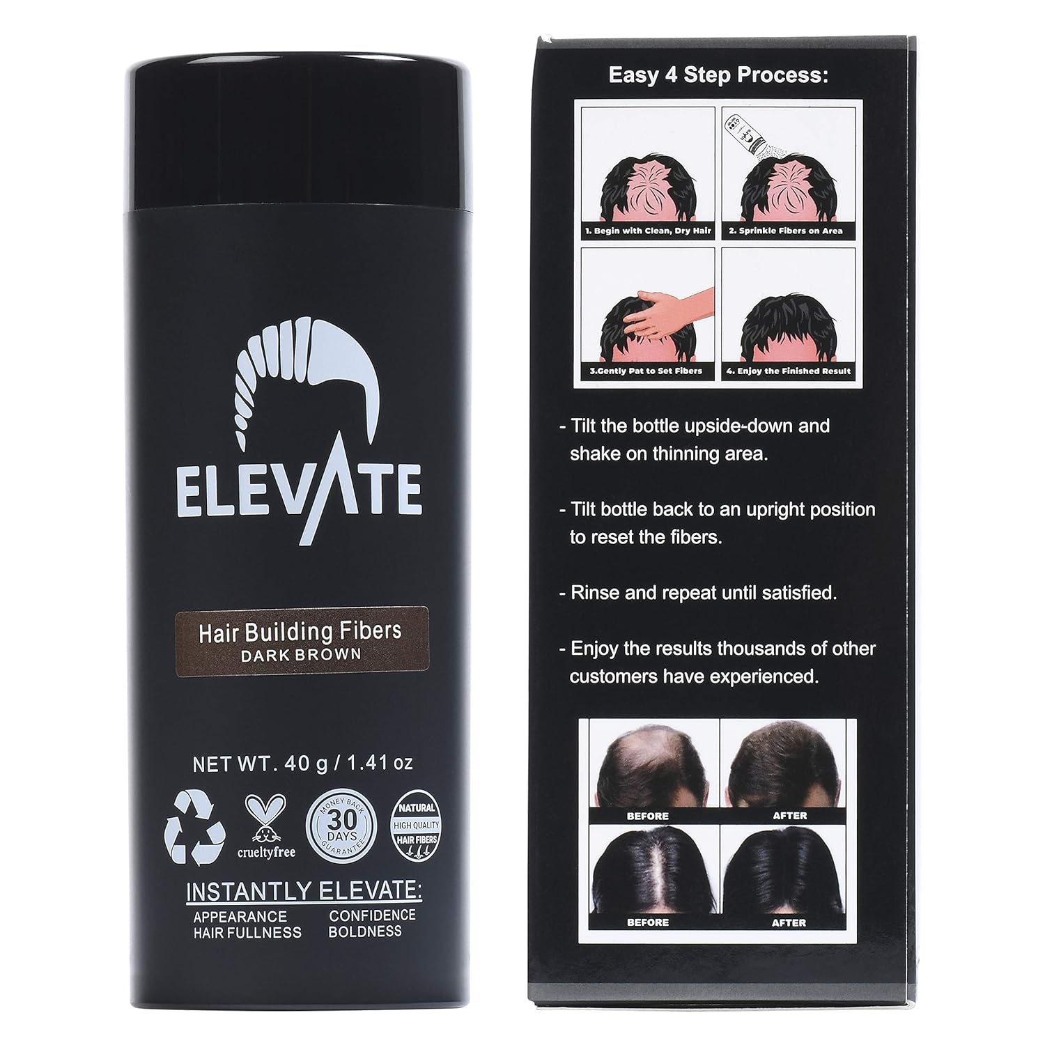 ELEVATE Hair Fibers for Thinning Hair Large Size 40g Bottle - 100% Natural Undetectable Keratin Fibers to Instantly Fill in Thinning Balding Loss Area Fuller in 30 Seconds Men & Women (Dark Brown)