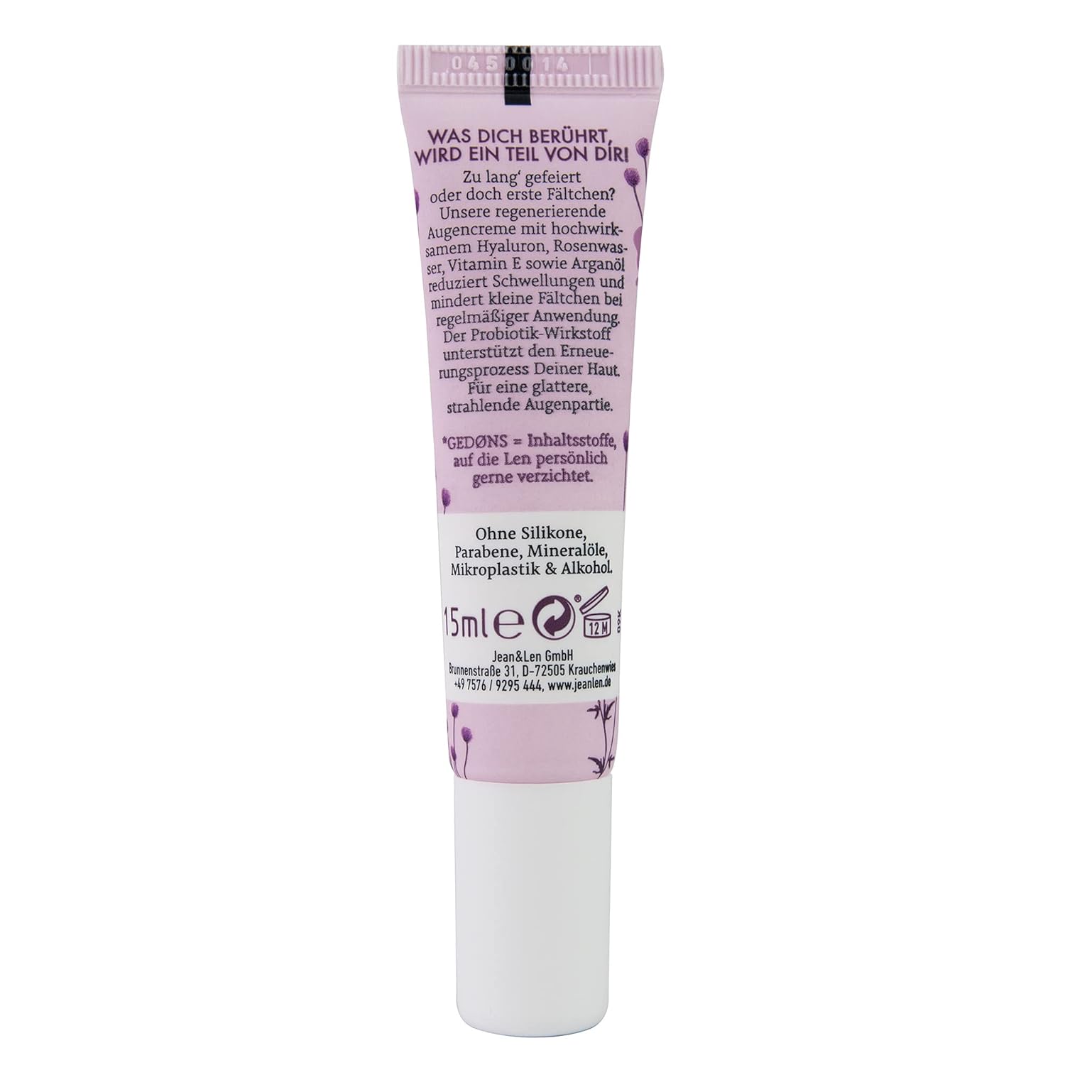 - EYE CREAM: Too much partying or seeing your first wrinkles? Our regenerating eye cream with highly effective hyaluronic acid, rose water, vitamin E and argan oil reduces puffiness and diminishes small wrinkles with regular use. The probiotic ingredient supports your skin’s renewal process. For a smoother, radiant eye area.