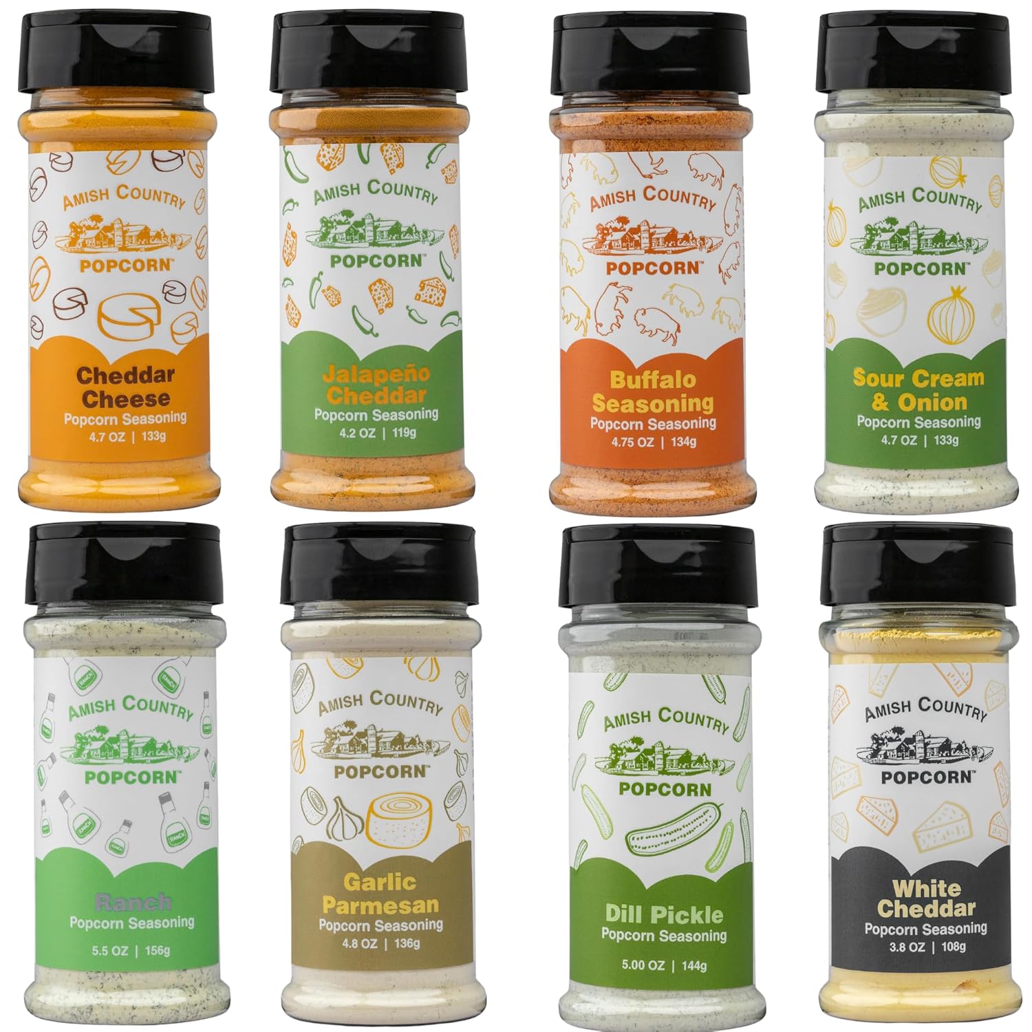 - 8 PACK SEASONING SAMPLER - Variety is the spice of life. Try all of our most popular seasonings on your Amish Country Popcorn. Each sampler includes Buffalo, Garlic Parmesan, Jalepeno Cheddar, Dill Pickle, Ranch, Cheddar, Sour Cream & Onion and White Cheddar. Try them alone or combine them, the possibilities are endless.