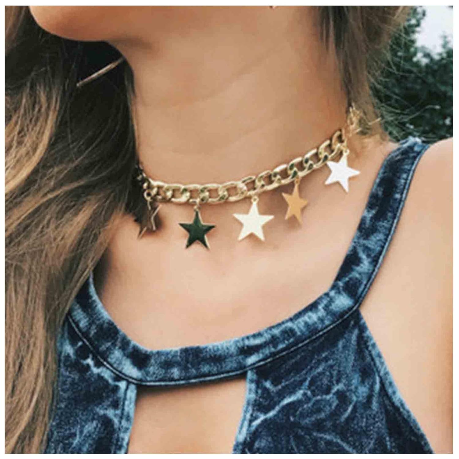Boho Star Dangle Choker Necklace Gold Chunky Curb Chain Necklace Punk Thick Chain Choker Necklace Minimal Short Chain Necklace Jewelry for Women and Girls