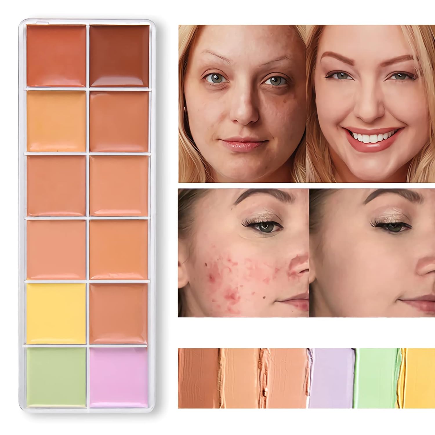 - 【Color Correcting Palette】palette helps conceal trouble spots and visibly correct discolorations; Light and medium camouflage imperfections, yellow conceal dullness and dark circles, green covers redness, pink brighten.