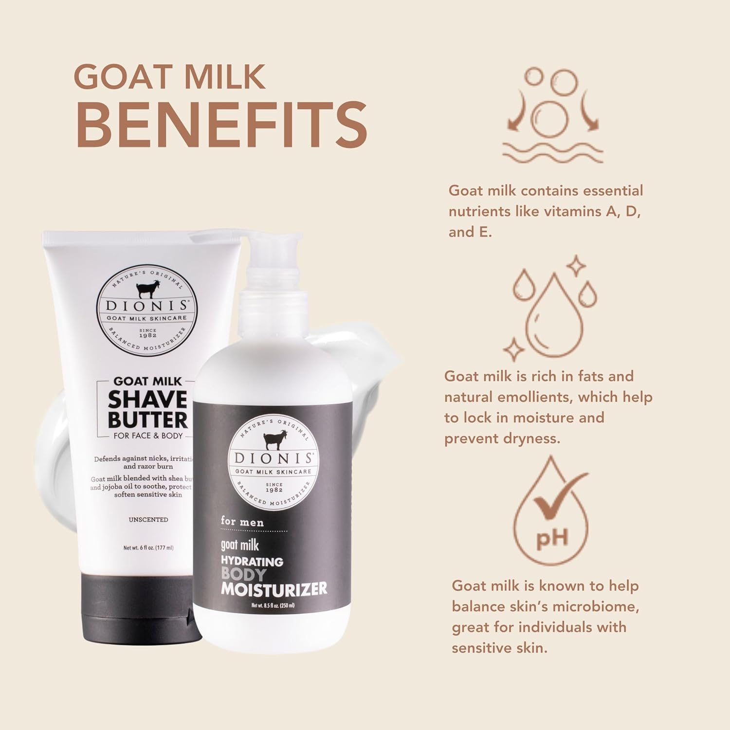 - For Dads on The Go - Treat Dad to the Dionis Shave Butter & Body Lotion set this Father's Day. Infused with nourishing goat milk, this duo offers a smooth shave and hydrated skin. Great for pampering and self care, it's a thoughtful gift that combines luxury and practicality for the special man in your life.