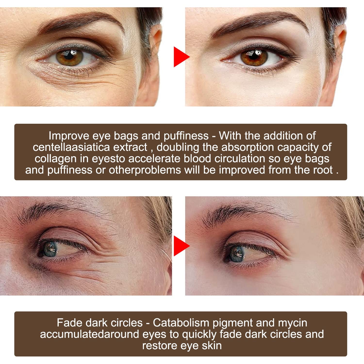 - Effection : Accelerate the metabolism of cells,improve eye circle solve the eye blood circulation pigment deposition. Synergy hyaluronic acid to accelerate the nutrition to solve the edema and eye bags. Best anti-aging eye serum cream, Anti-wrinkle anti age.