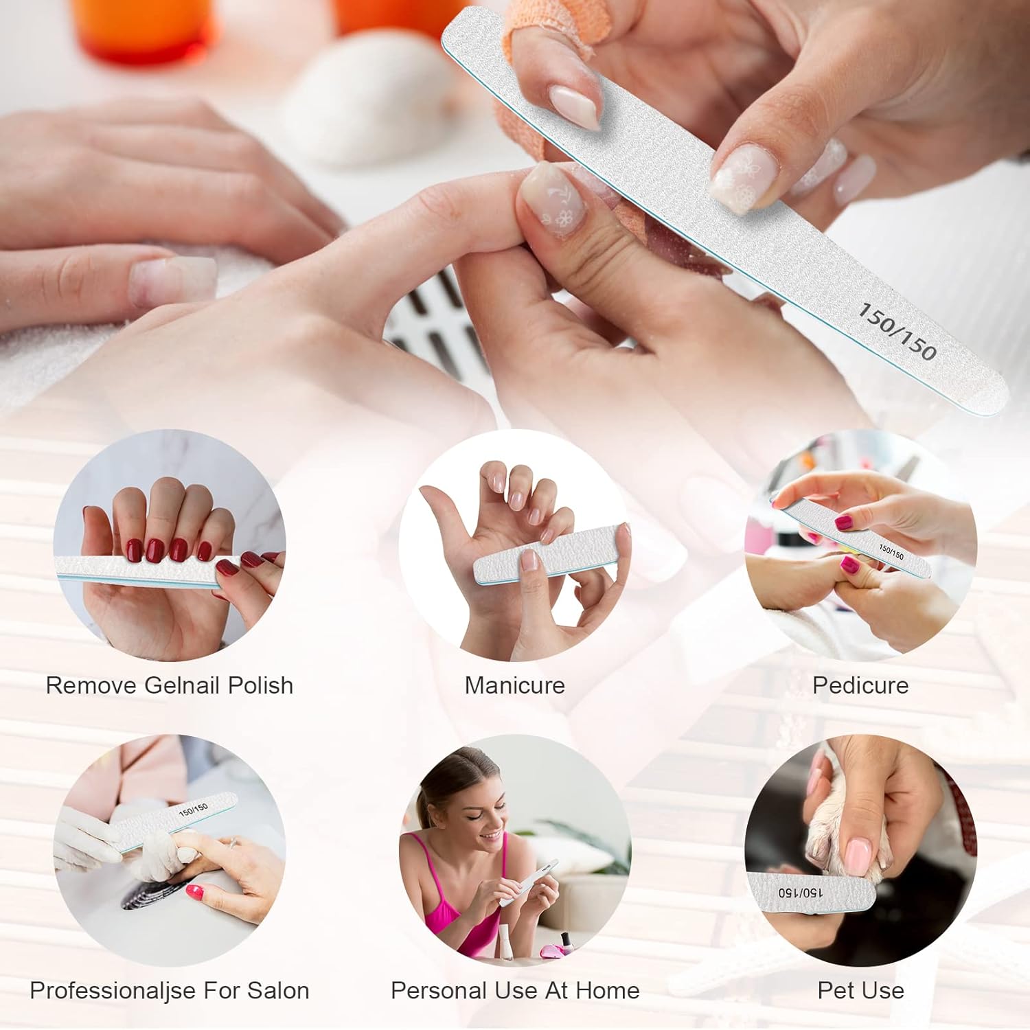 - Premium Emery Boards for Nails : The 150/150 Nail Files are made with top quality adhesive tape & sandpaper, emery board materials, ECO sponge and strong PP board, Designed with racket shape & Double Sides.