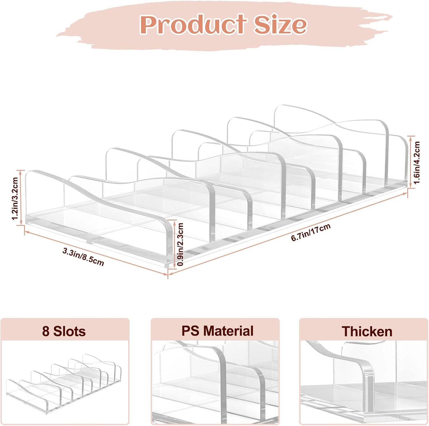 - ăPerfect Sizeă8-slot eye shadow palettes stand size: 6.6 x 3.5 x 2 inches, each inner measuring at 6.1x1.1 inches. you can stand the acrylic cosmetic organizer upright on the counter or lay it flat in a makeup drawer to save space.