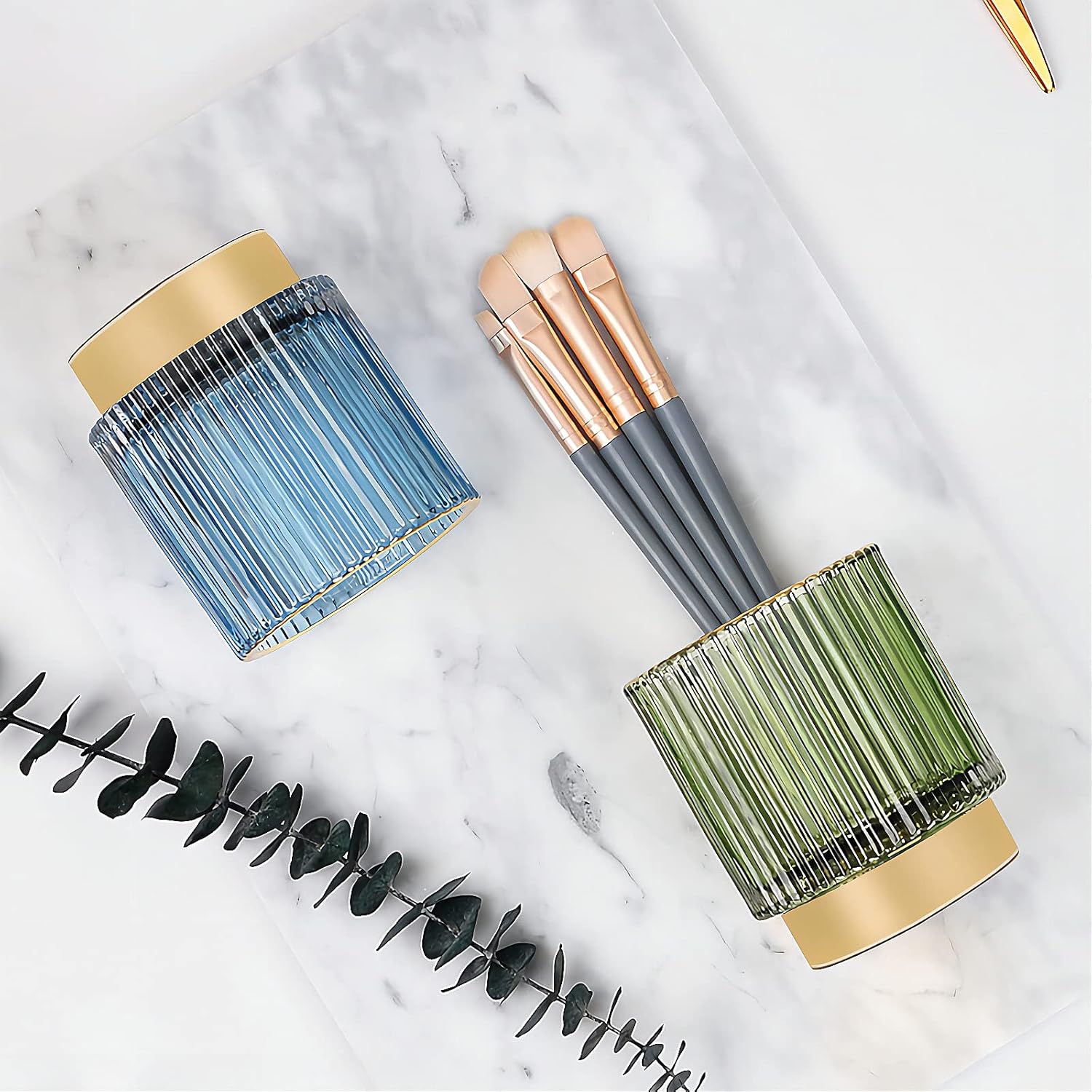 DASITON Makeup Brush holder Organizer,Crystal Cosmetic Makeup Brush Glass Brushes Storage Holder, Vintage Make Up Brush Cup Pen Pencil Holder striped vase(Blue S)