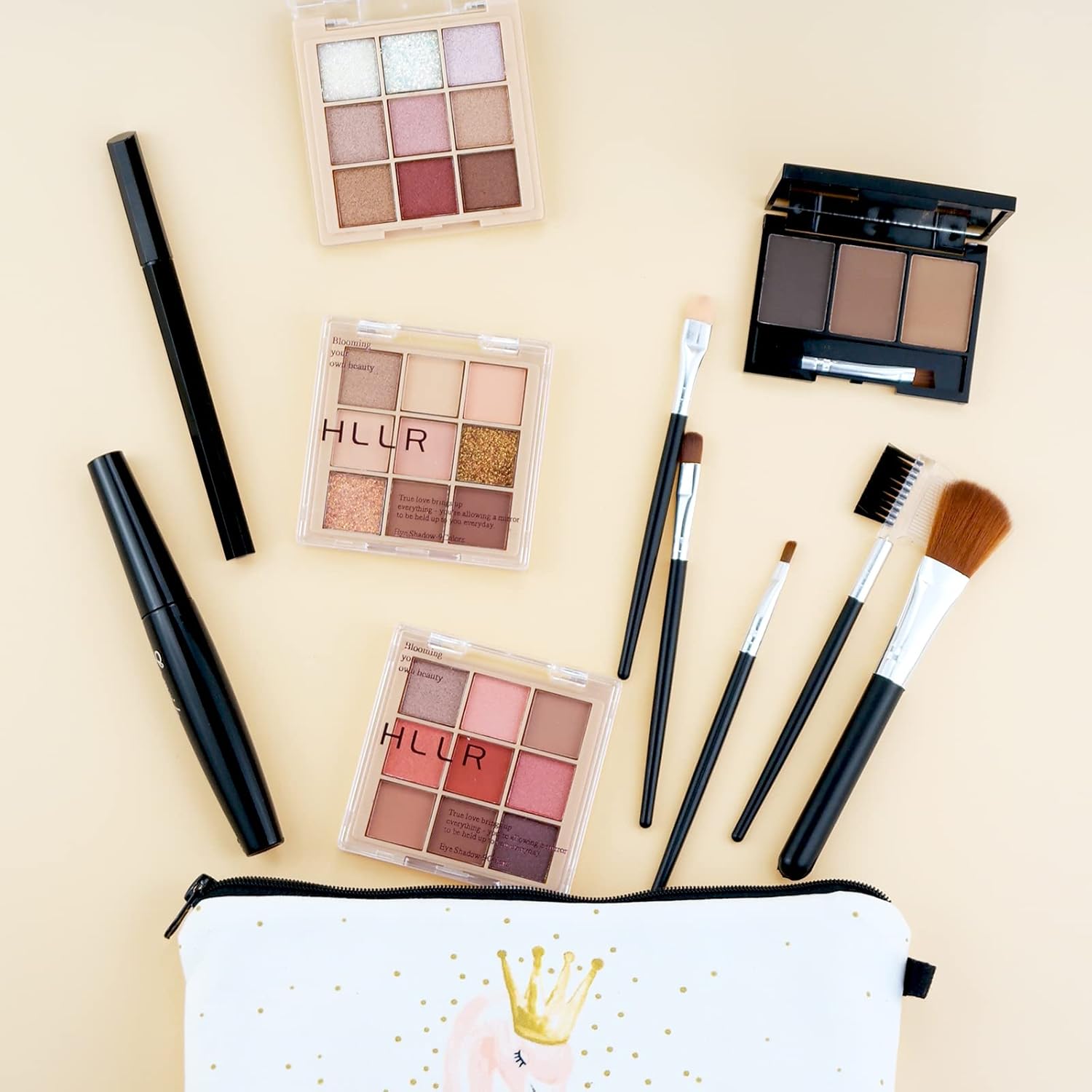 - 💄ALL IN ONE MAKEUP KIT FOR GIRLS - This makeup kits for women contains: 3 x 9 sweet & gentle colors eyeshadow palette, 1 x waterproof and smudge-shield mascara, 1 x waterproof and smooth liquid eyeliner, 1 x tri-color eyebrow powder, 1 x flamingo waterproof material cosmetic bag, 1 x 7pcs Soft Makeup Brush Set. The simple make up set is perfect for makeup artists or starters and beginners achieving a full-face flawless, natural and nude eye makeup effects.