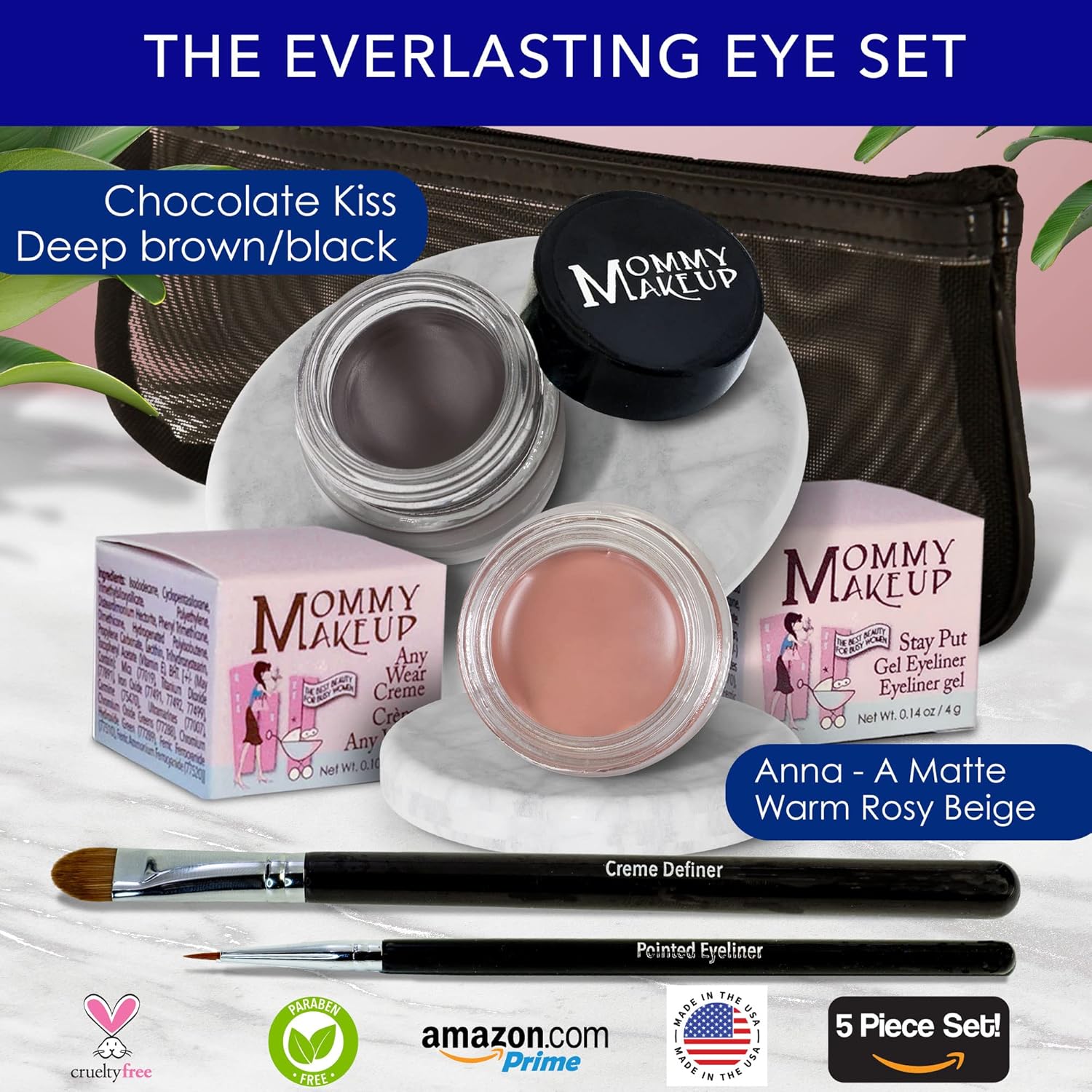- The Everlasting Eye is a 5 Piece Waterproof Makeup Set. Gel Eyeliner, Creme Eyeshadow, 2 brushes and Mesh Bag. Paraben-free, Talc-free, PETA Certified cruelty-free.