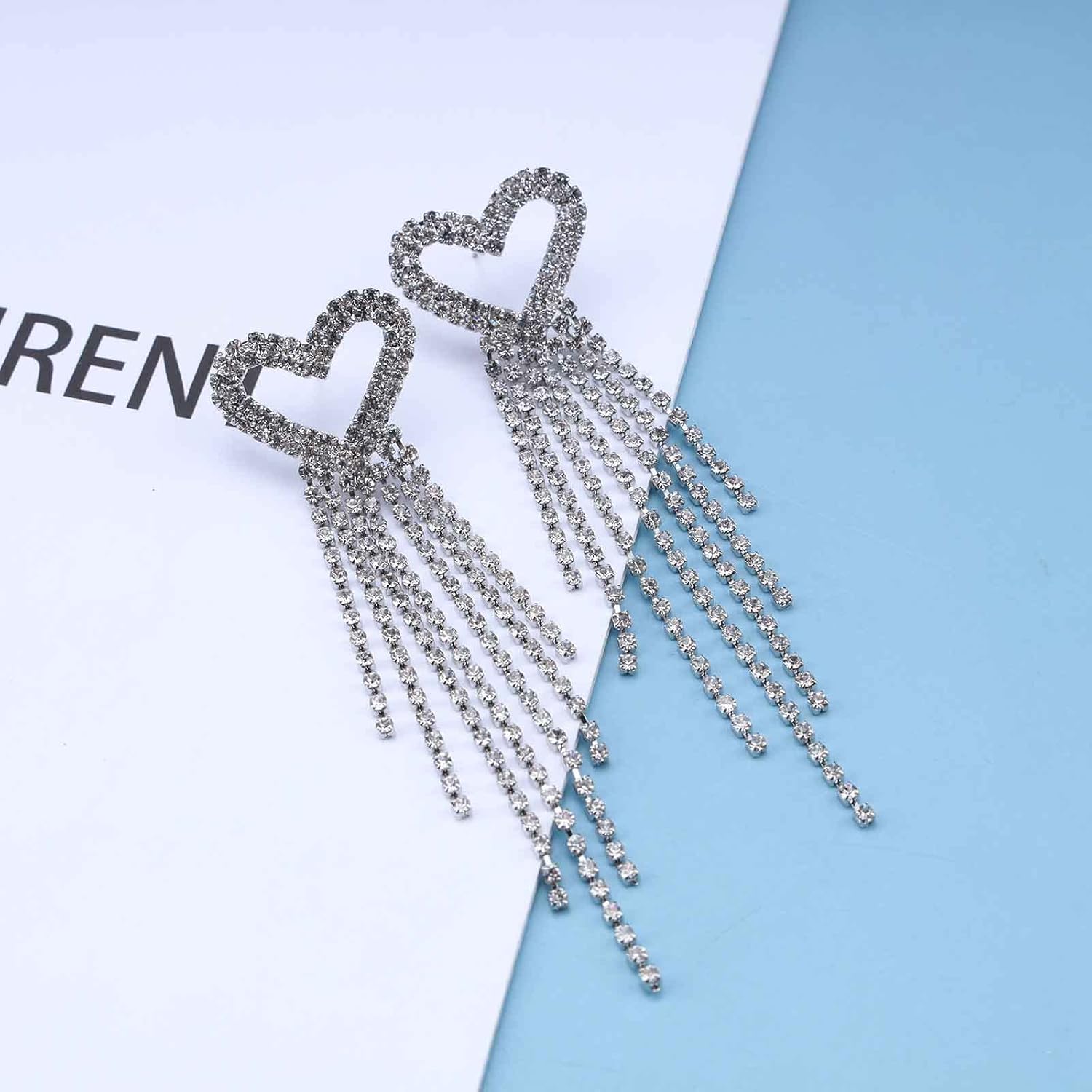 Boho Rhinestone Heart Tassel Earrings Long Tassel Chain Dangle Earrings Silver Crystal Cz Love Heart Studs Earrings Long Chandelier Dangle Earrings Wedding Cz Fringe Chain Earrings Jewelry for Women and Girls