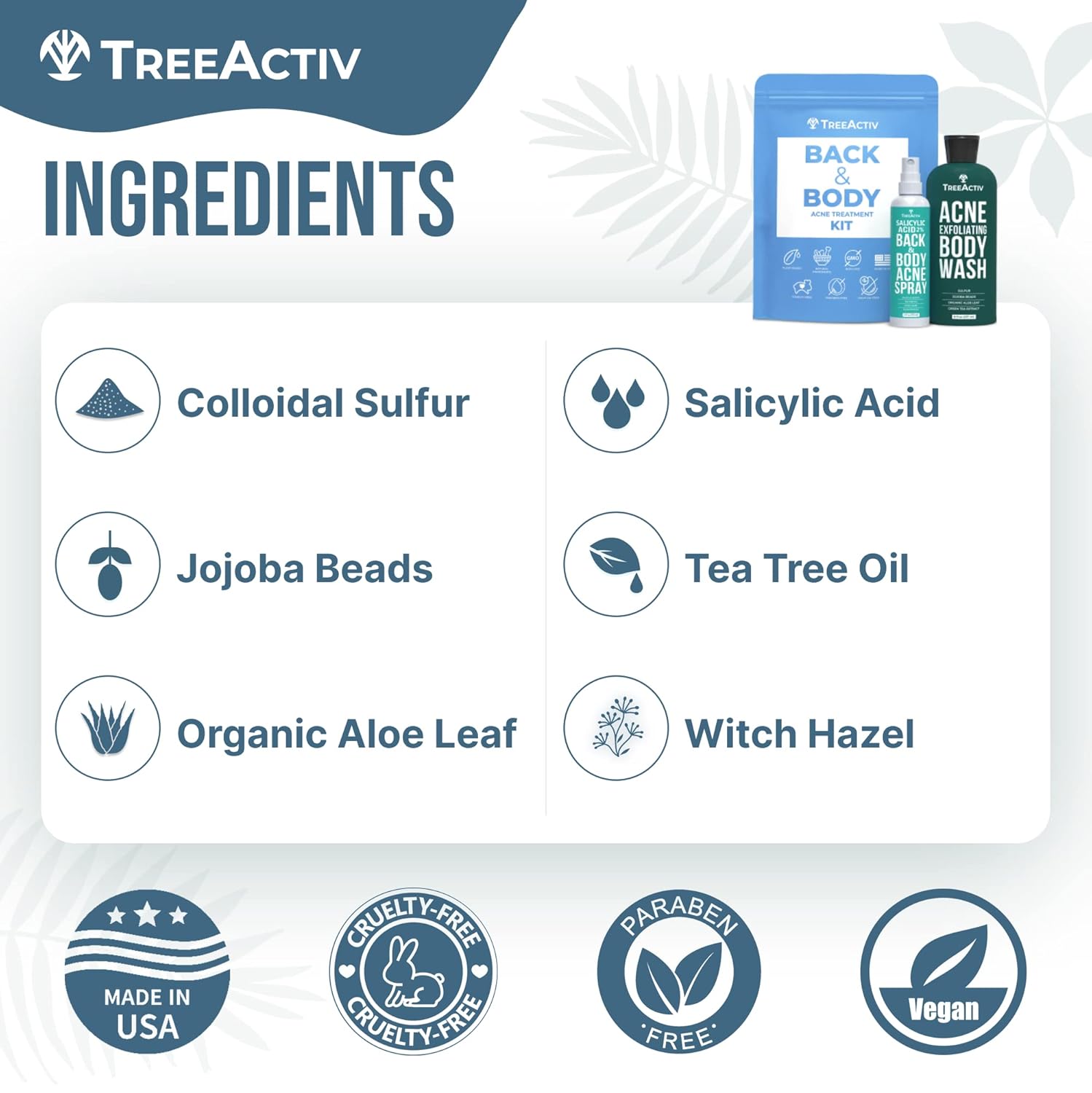 - Quick and Effective Acne Relief: TreeActiv 90-Day Body Acne Treatment Kit is a potent duo designed to combat body acne. The salicylic acid acne body spray and exfoliating body acne wash work together to deliver quick and effective relief from stubborn body acne.