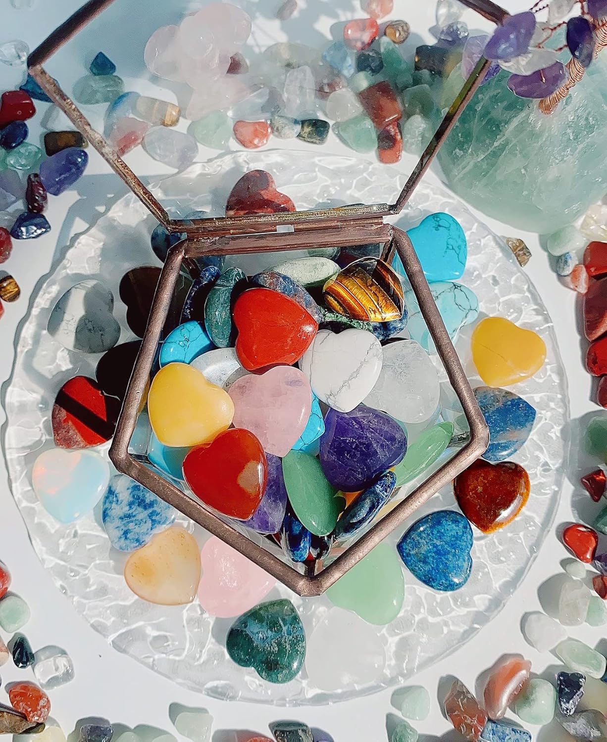 - 【 Basic Information 】 Specification attributes : 15 PCS Set Mini Heart Shaped Crystal -- Rose Quartz, Clear Crystal, Unakite, Tigers Eye, Green Aventurine, Black Obsidian, Red Carnelian, Yellow Aventurine, Amethyst, Lapis lazuli, Red Jasper, Opalite, Grey Labradorite, Dalmatian Jasper, Malachite. (appro.)Size : 0.8*0.8*0.24 ". Convenient to put in your pocket and hold in your hand to conduct energy guidance. It is suitable as a gift for crystal lovers, crystal beginners, craft lovers.