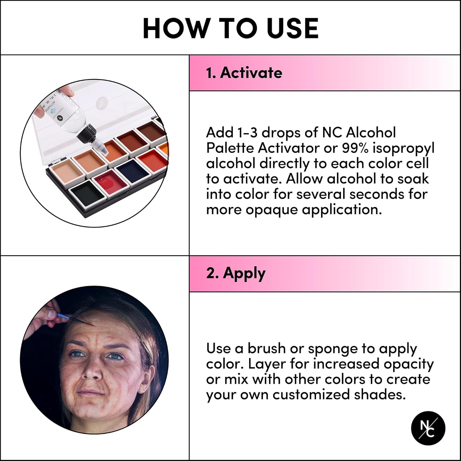 • ALCOHOL-ACTIVATED: Palette colors will appear dry or cracked before activation; Add 99% isopropyl rubbing alcohol or Activator to the pigments before every application