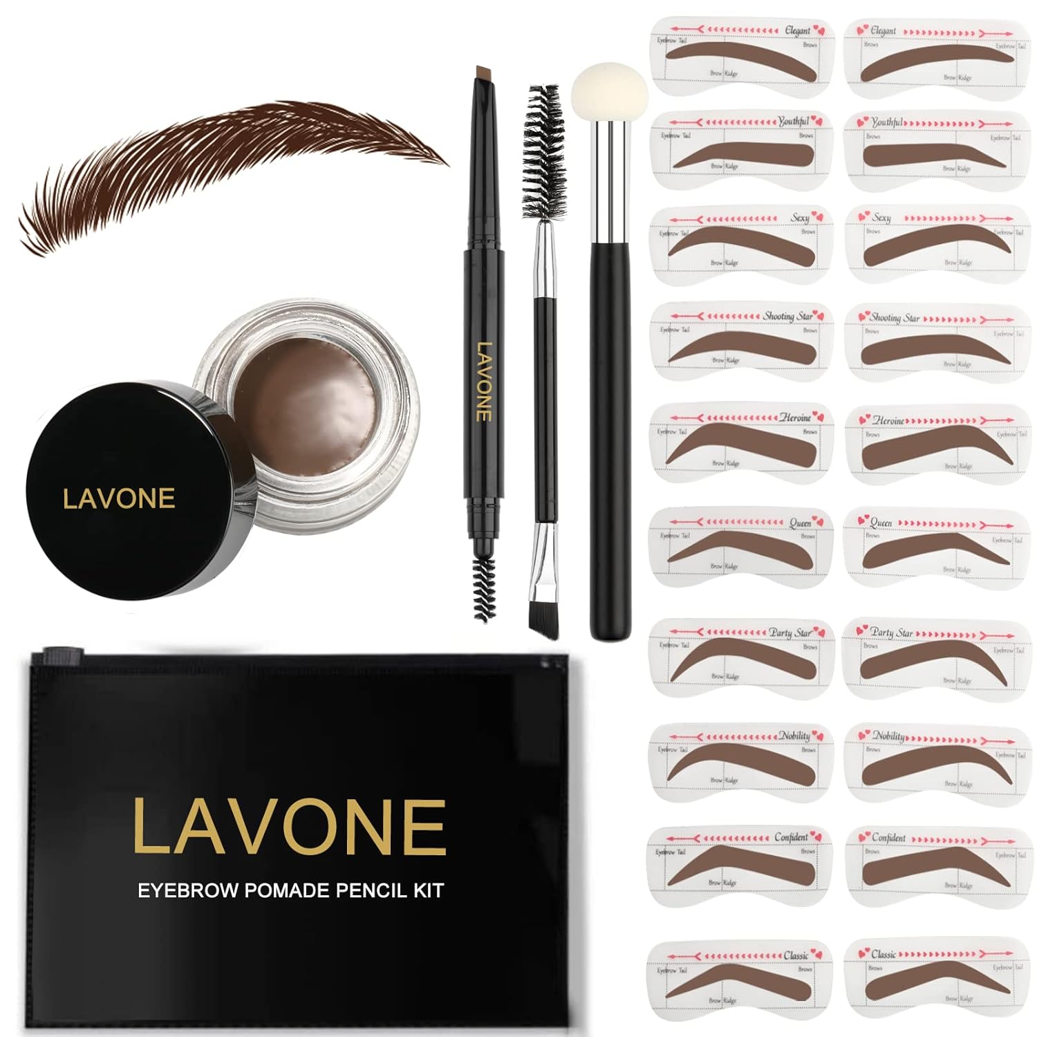 - [Whatโs in the eyebrow kit]: LAVONE makeup eyebrow kit includes brow pencil (dark brown), eyebrow powder(dark brown), 20 eyebrow stencils (10 different shapes), a sponge applicator, a dual precision brush and a zipper pouch for on the go.