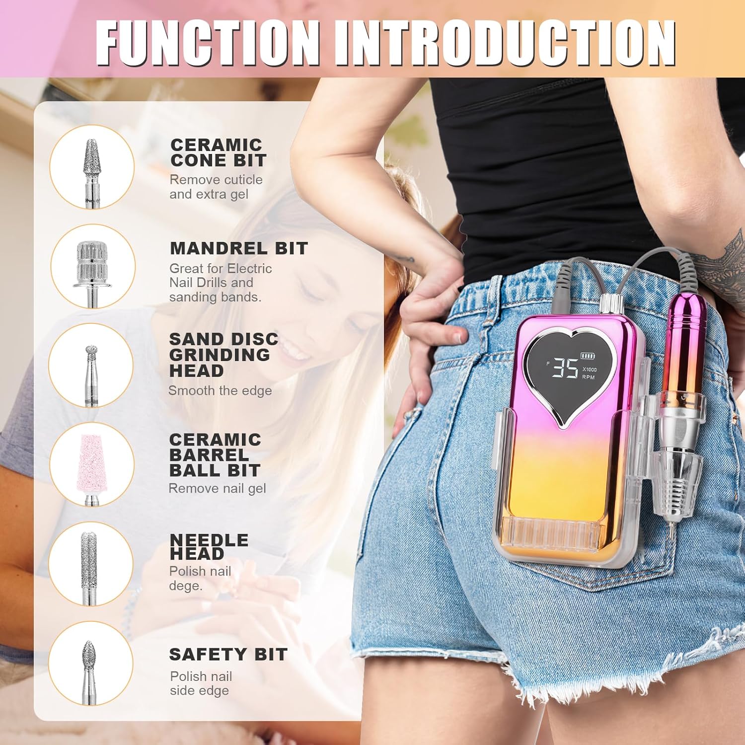 Professional Electric Nail Drill Machine for Acrylic Nails, 35000 RPM Electric Nail File Tool Set, Portable E-File Rechargeable Manicure Pedicure Polish Kit for Home Salon Tech (Heart Sunset Gold)