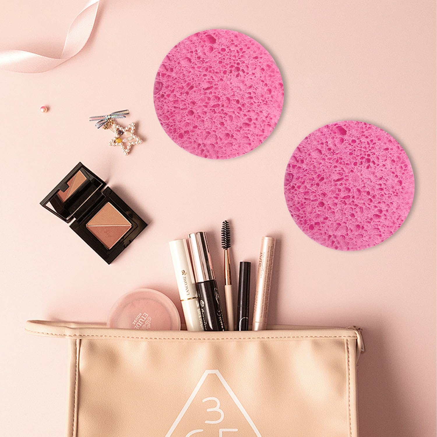 50-Count Facial Sponges, Compressed Natural Cellulose, Pink, Round Shape, Face Cleansing, Exfoliating, Makeup Removal