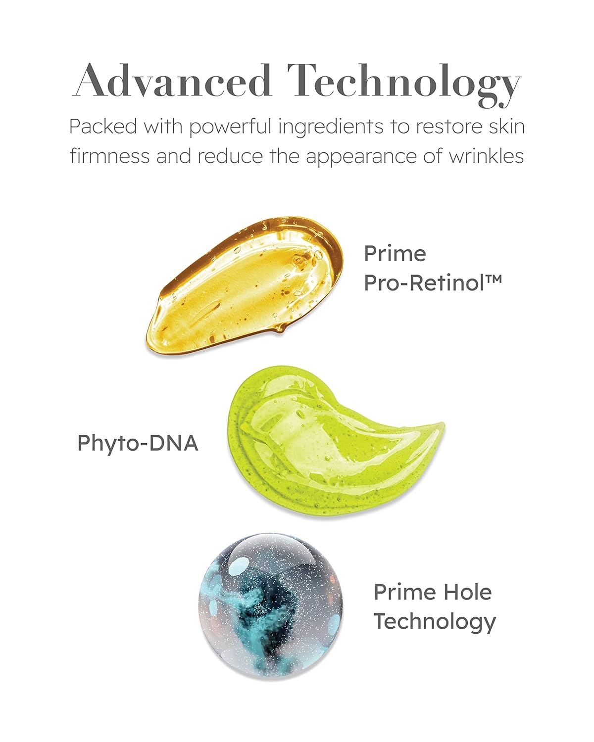 - PRIME HOLE TECHNOLOGY - Formulation backed by science, this highly absorbent formula encapsulates active ingredients in Squalane allowing deeper and better penetration into the skin to deliver firming, moisturizing, and illuminating benefits.