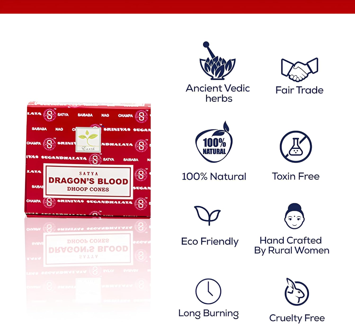 - β 144 Dhoop Cones in 12 Boxes: Each pack contains 12 boxes, each filled with 12 earthy and soothing dragons blood-scented dhoop cones, providing you with a total of 144 cones for long-lasting use.
