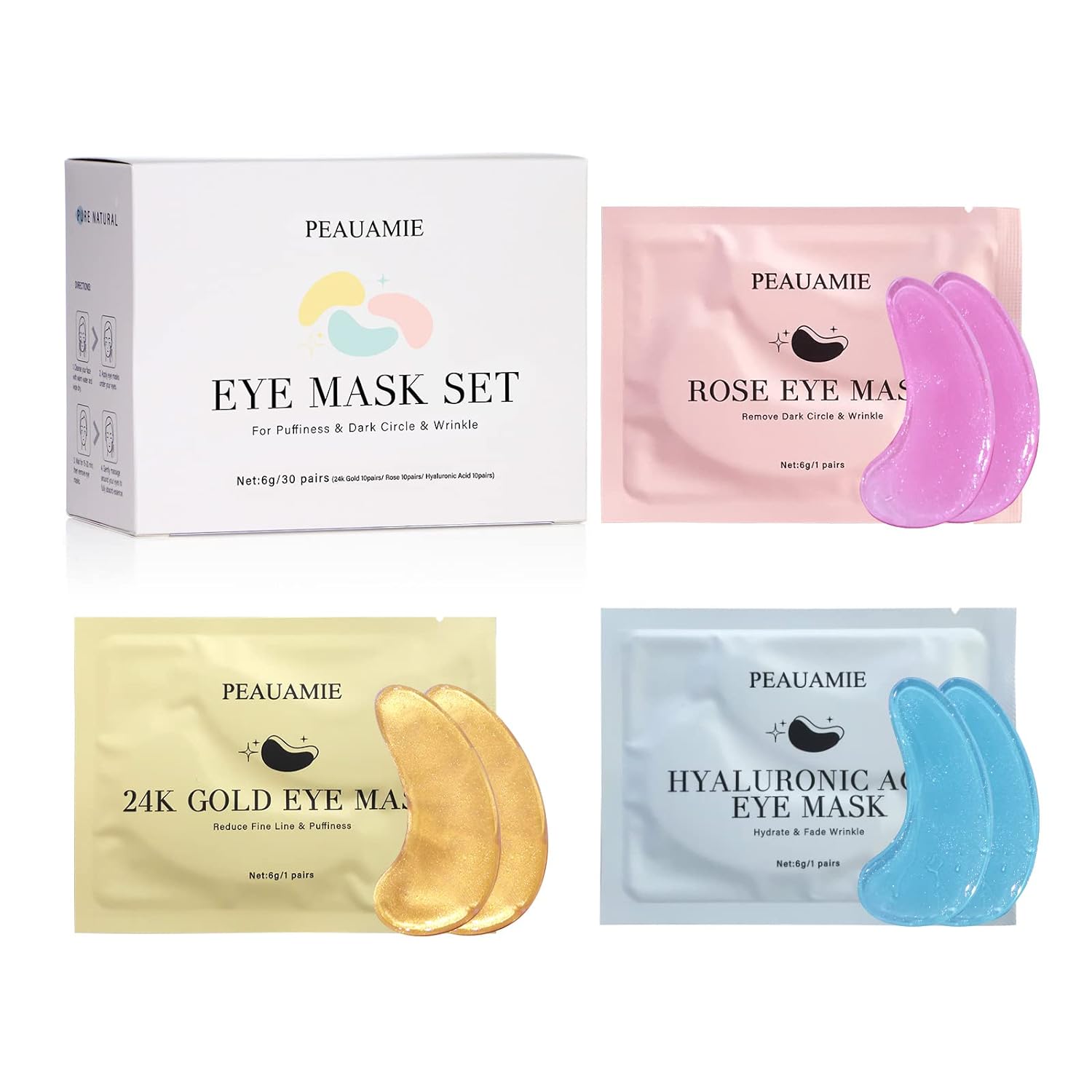 - Independent Packaging: This product contains 10 pairs of rose eye mask, 10 pairs of hyaluronic acid eye mask, and 10 pairs of 24K gold eye mask. 24K Gold Eye Mask helps rejuvenate the eye-contour skin, such as fine line and puffiness. Hyaluronic Acid Eye Mask helps hydrate skin and fade wrinkle. Rose Eye Mask helpsto remove dark circle.Each pair of eye mask is independent packaging to ensure that it will not be contaminated