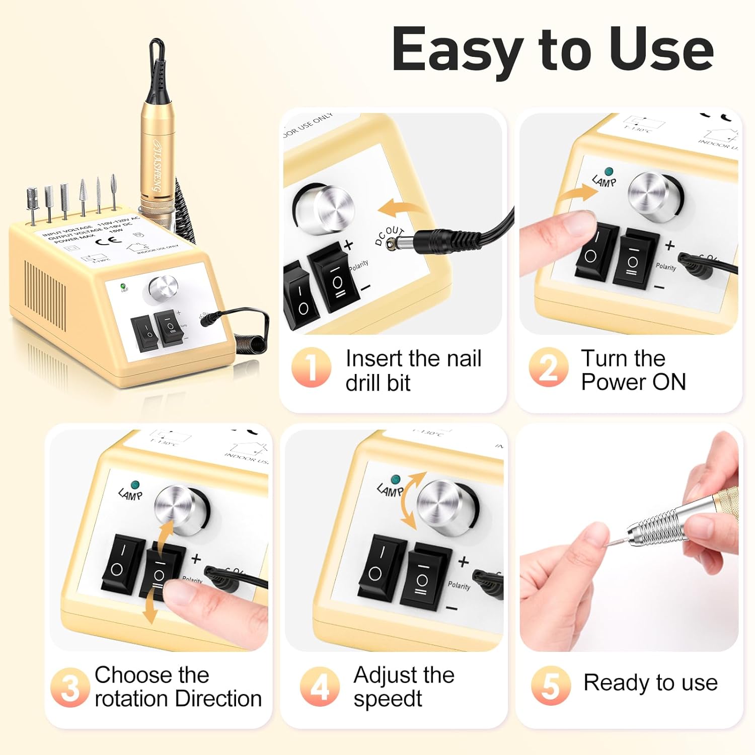 - Nail Drill: Jiasheng Nail Drill is powerful, speed up to 20000rpm, it emits less noise and heat than other drill, and the hand piece is small enough to fit in your hand, you wonβt feel hand fatigue during your operation for polishing acrylic nails