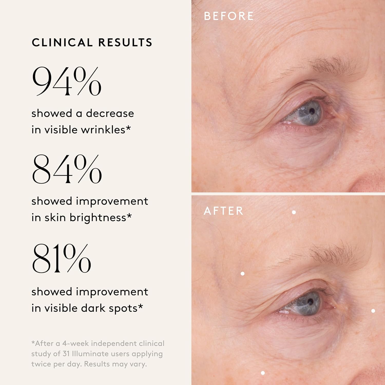 - CLINICAL RESULTS: After a 4-week independent clinical study of 31 Illuminate users, 94% showed a decrease in the appearance of fine lines & wrinkles, 84% improved visible skin radiance, and 100% showed an increase in hydration.*