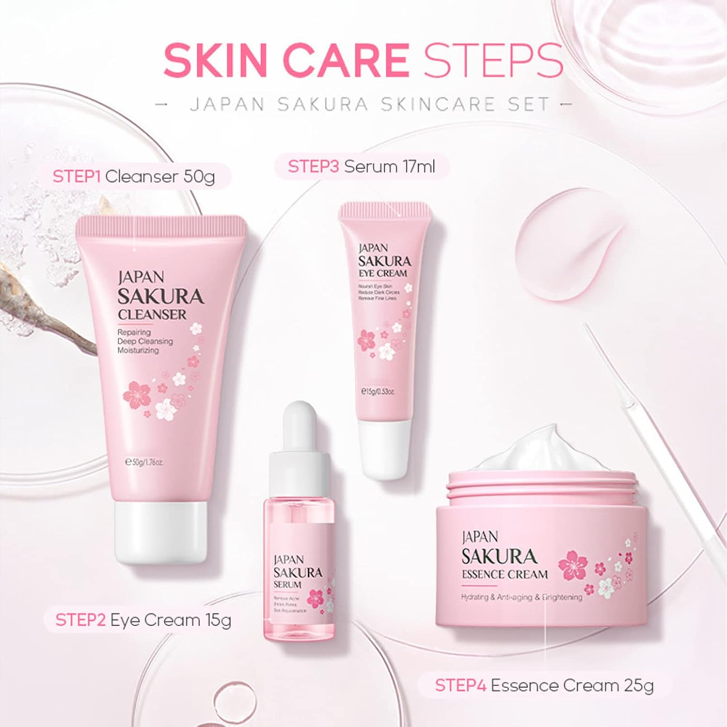 - ★【Sakura Skin Care Set】: Sakura Skin Care Set is rich in sakura essence, making the skin moist and soft. Sakura serum has the effects of shrinking pores, balancing the skin secretion of water and oil, rejuvenating skin.Our sakura face care set can help the skin resist oxidation and reduce Fine Lines