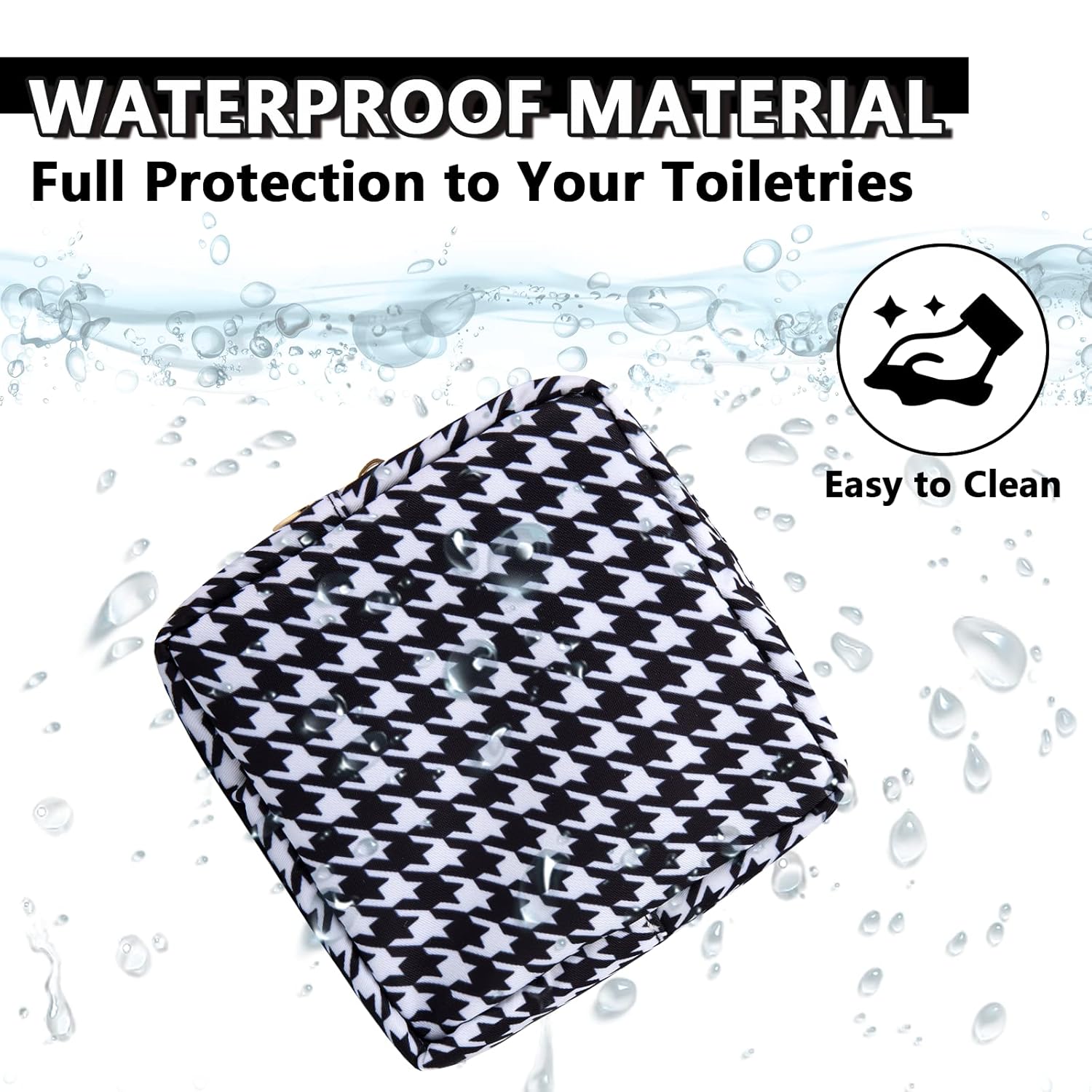 - 【Multiple Options】The waterproof makeup bag has four sizes, Mini(4.75''*2''*5''), Small(9.5''*2''*5''), Large(11''*5''*8'') and Slim(2.75*8''*2.75''). You can choose the right size according to the items you want to store. We have four types of patterns, Pink Heart, Houndstooth, Checkerboard grid and White Heart. You can enjoy choosing the pattern you like.