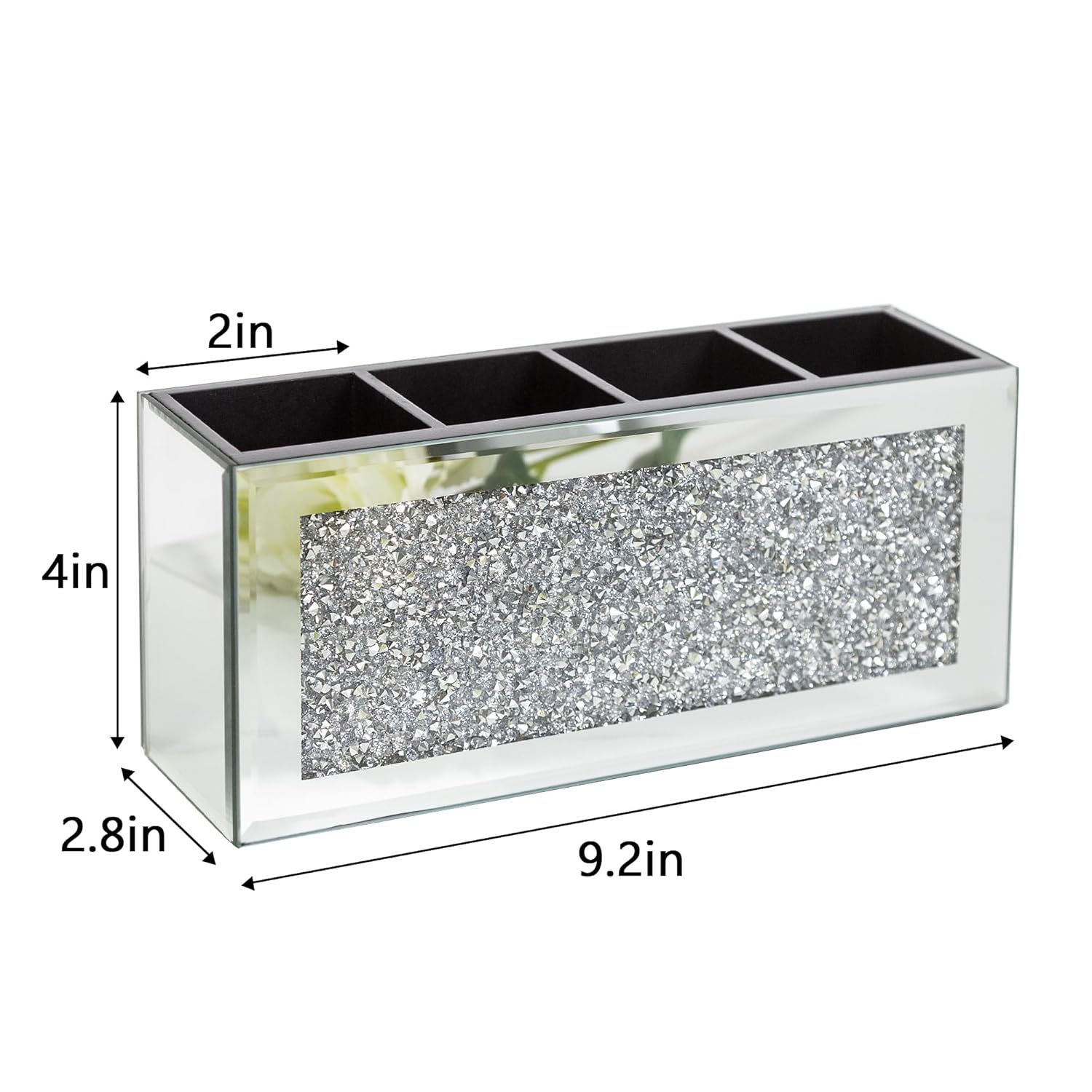 • MATERIAL - Makeup brush holder is made of HD mirror glass and MDF, inlaid with stunning bling crystal crushed diamonds on the front, suitable for any decoration.