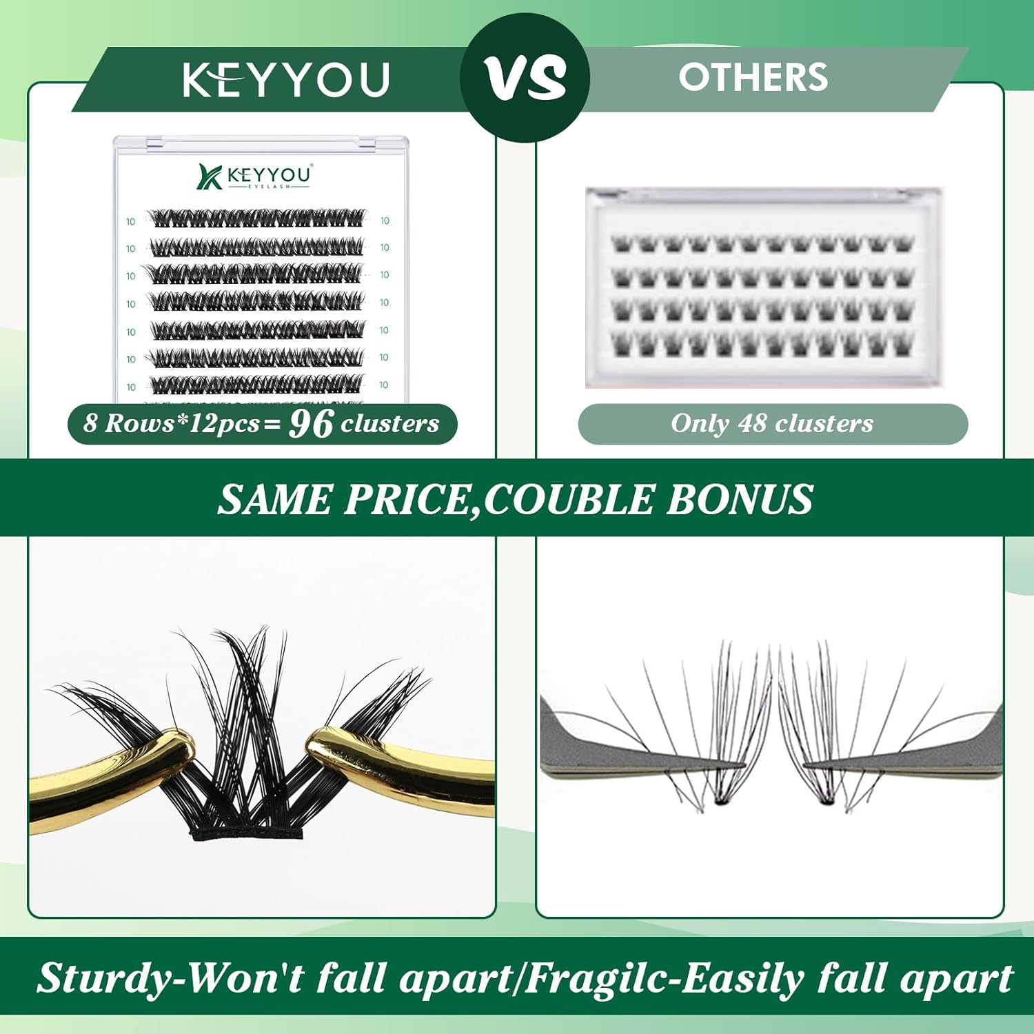- 【Soft&Comfortable】KEYYOU lash cluster are made of imported materials,the stem line is thinner and softer, the eyelash cluster are lighter and more comfortable to wear.96 clusters in one tray ,more cost-effective.