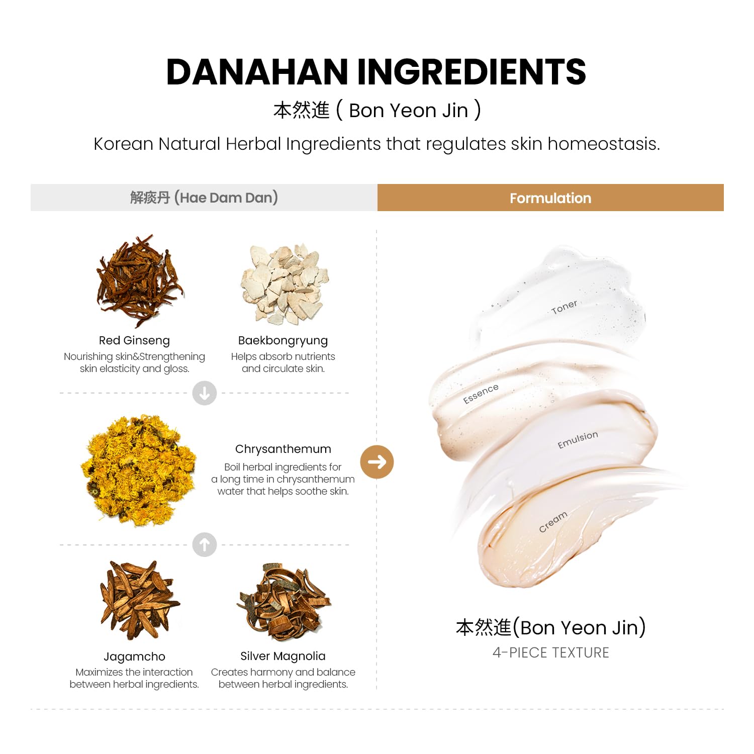 - Danahan Bon Yeon Jin is made with a powerful skin-rejuvenating formula of high-quality Red Ginseng and natural Korean natural herbal medicine to hydrate, nourish, and visibly rejuvenate skin.