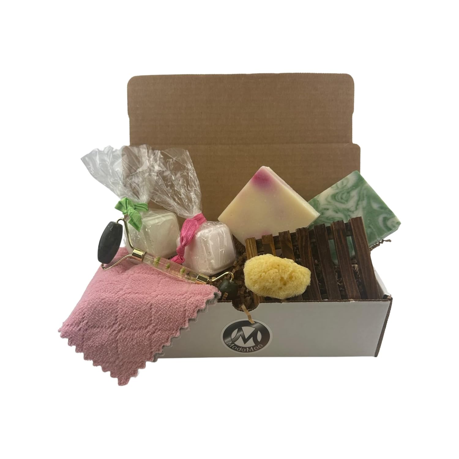 ModaMoo's Day Spa Gift Box Set. Cucumber Melon and Asian Tea Blossom Soaps, Jade Roller, Sea Sponge, and More