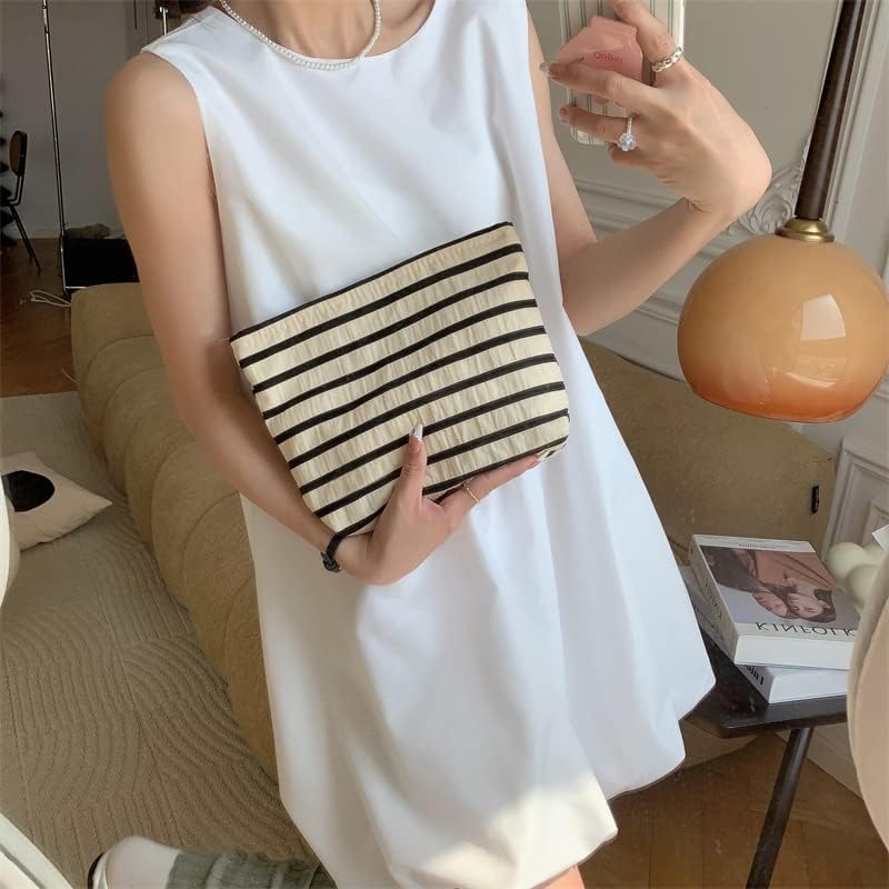 PAZIMIIK Floral Makeup Bag Large Cotton Zipper Pouch for Purse Travel Canvas Make Up Organizer for Women Cosmetic,Stripe White
