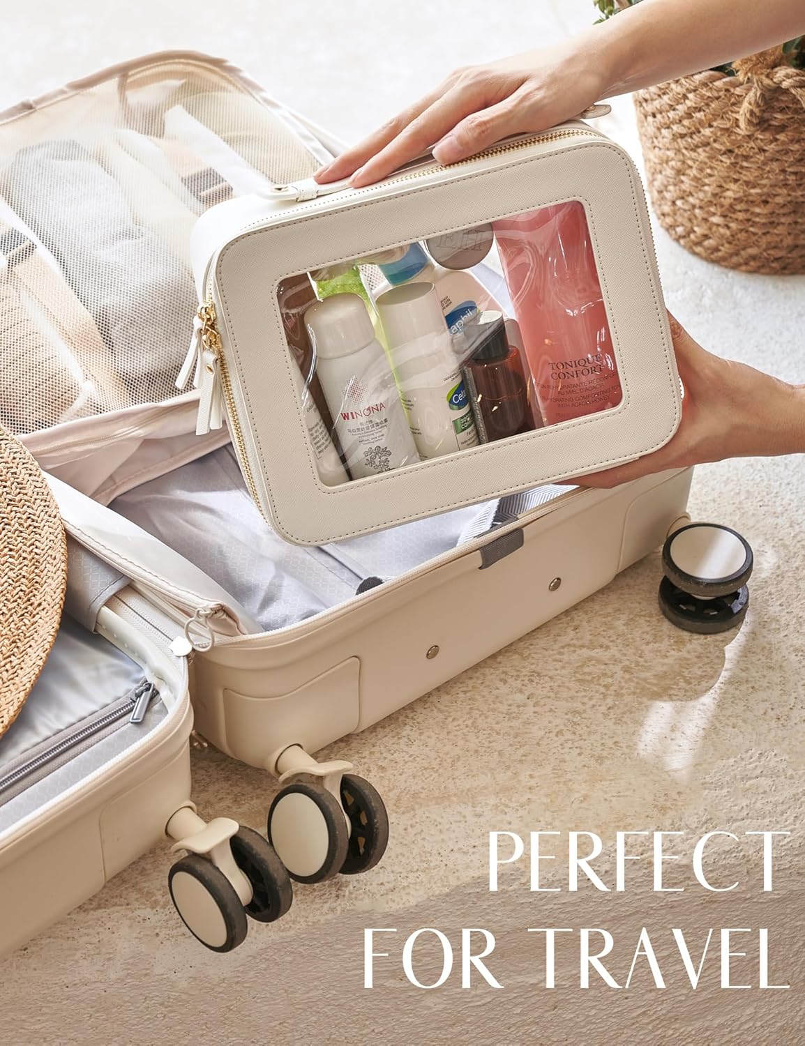 - [Premium Material and Durability] β The clear cosmetic case, both the exterior and interior, is crafted from high-grade saffiano faux leather, which is highly scratch resistant, durable and exceptionally easy to keep clean. It features a smooth zipper for secure closure, and elegant light gold metal hardware accents, adding a luxurious and sophisticated touch to the bag's overall design.