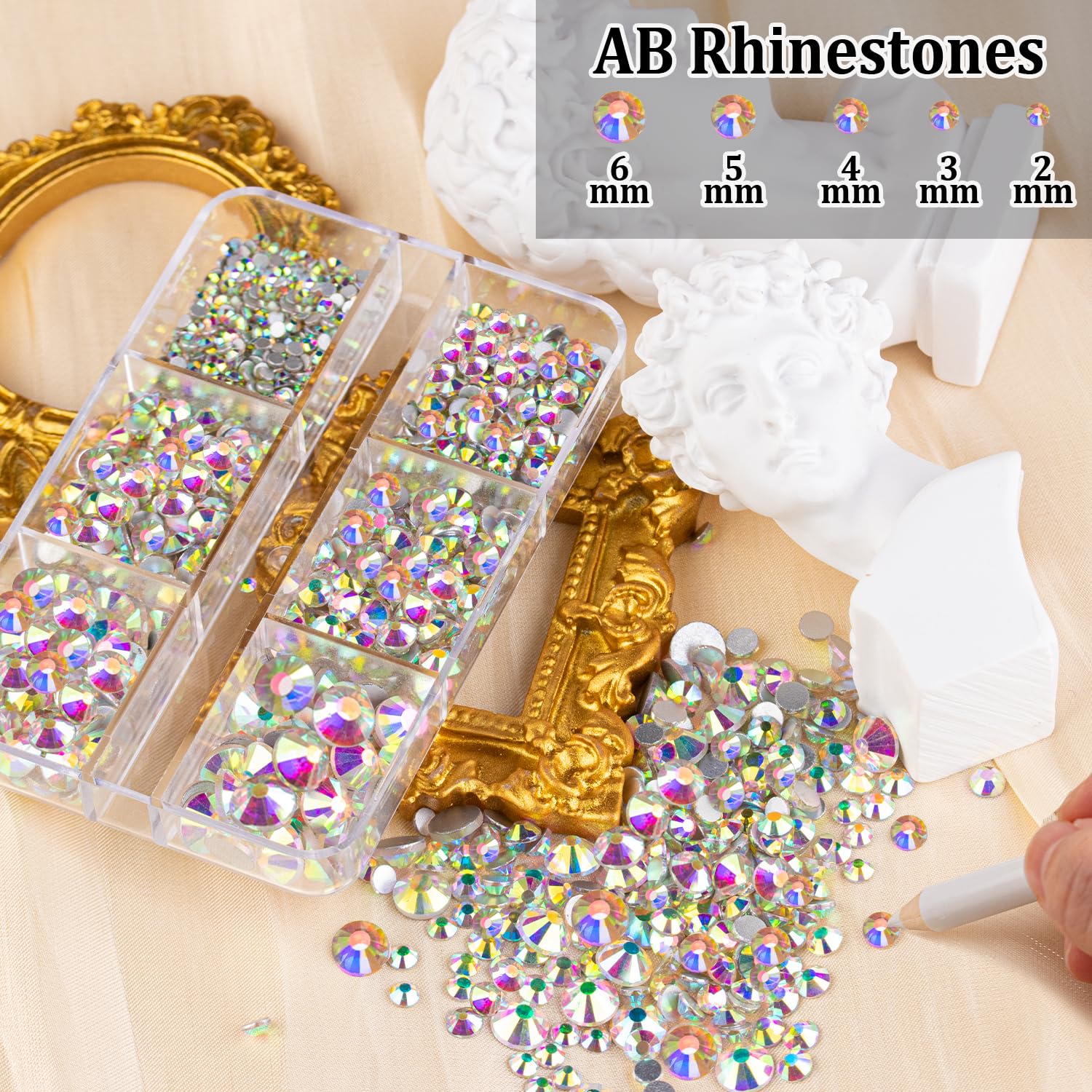 - ❤FACE DIAMONDS MAKEUP KIT--You will get 2 boxes of round flatbacked AB glass gems with different sizes(2/3/4/5/6mm), 1 makeup glue, 1 pickup pencil, 1 dual-end dotting tool and 1 tweezers. This set is professional enough to satisfy your makeup needs and create your own beauty. The box is designed with independent lid for each grid which can help you store the gems and distinguish different sizes.