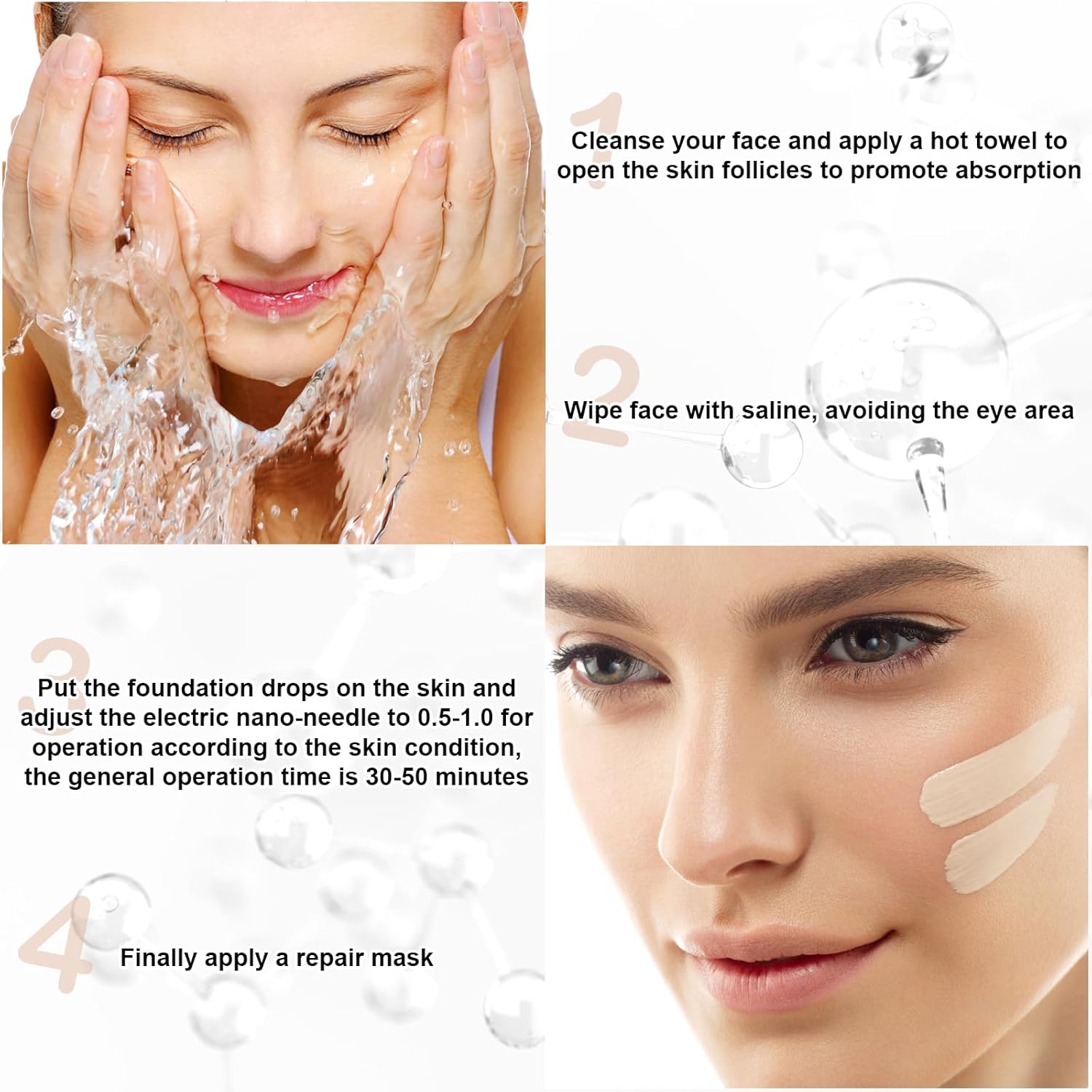 - How to use :1, clean facial skin to keep dry 2, with a towel hot compress 5-10 minutes to open the hair follicles to promote absorption 3, with saline wipe face 4γDrop the foundation on the face and use the microneedle to operate"