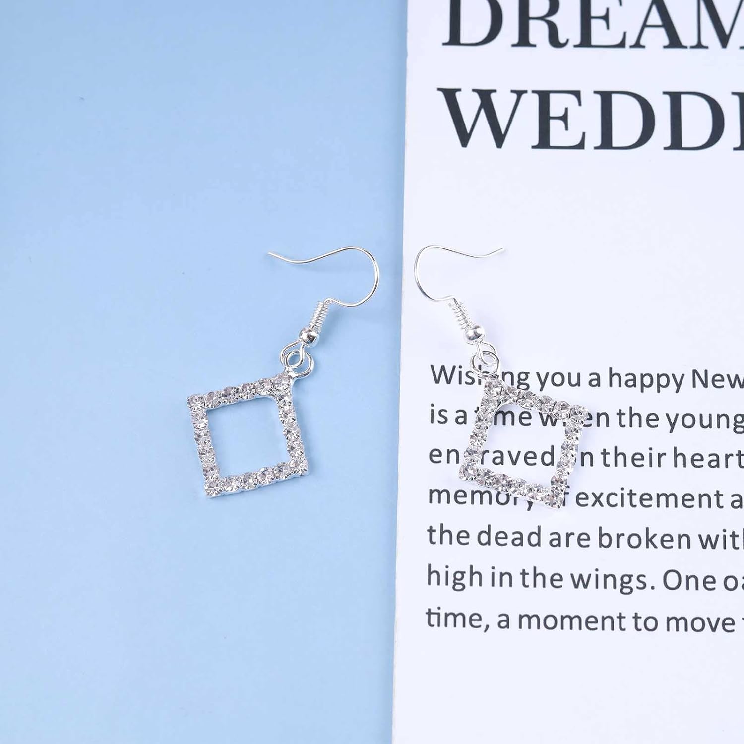 Vintage Crystal Square Drop Earrings Rhinestone Square Dangle Earrings Hollow Square Hook Earrings Silver Sparkly Cz Square Earrings Jewelry for Women