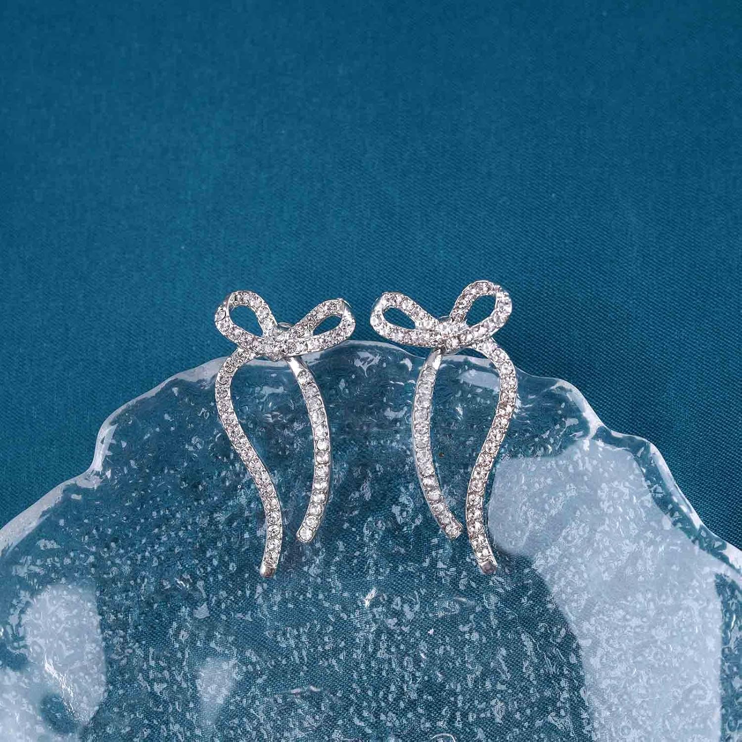 - Crystal bow drop earrings.Item Details:Handmade Item.Size:As Shown.Color:Silver.Materials:Quality Alloy/Crystal.Location:Ear.Style:Boho/Vintage.