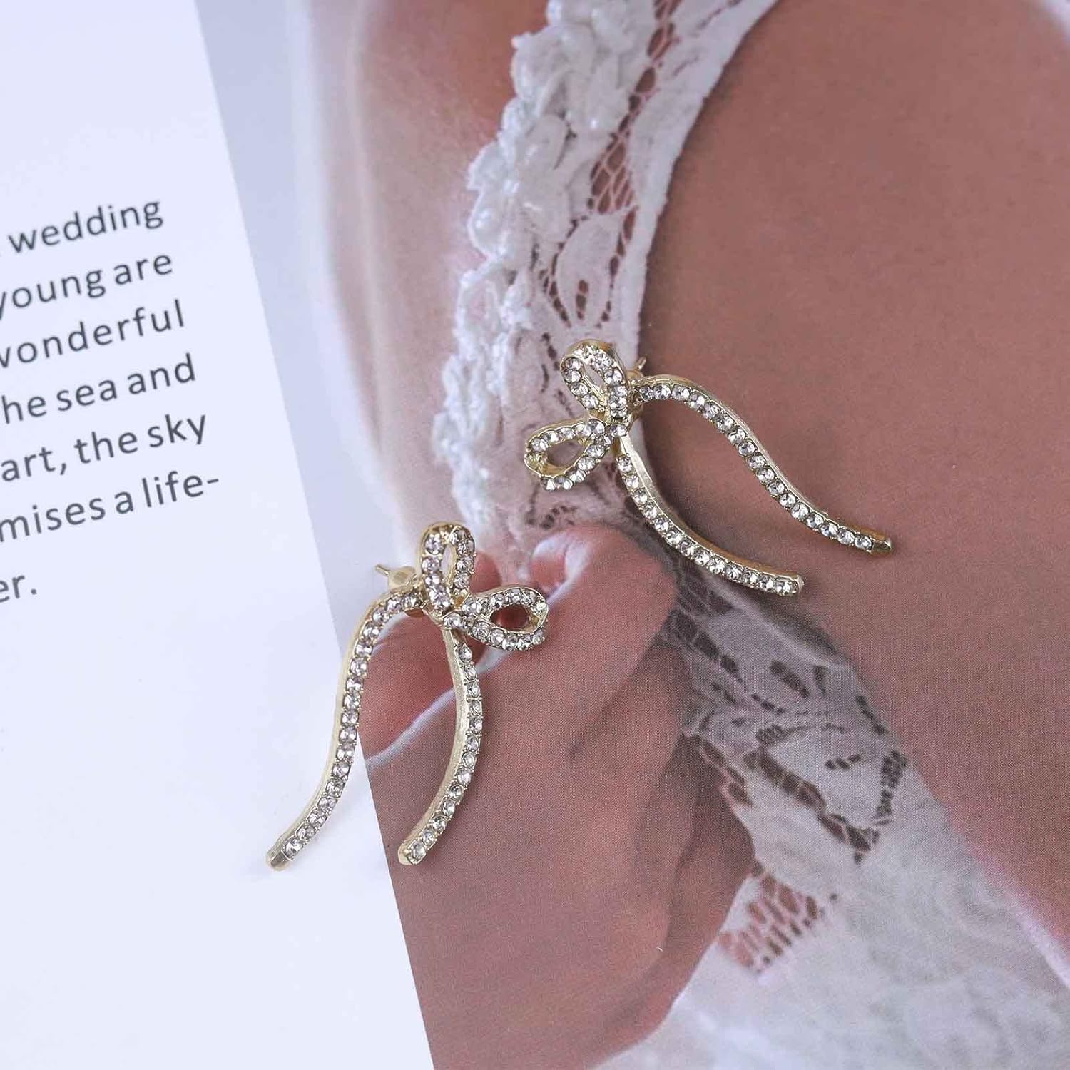 Vintage Crystal Bow Earrings Rhinestone Bow Drop Earrings Long Cz Rhinestone Earrings Gold Bow Cz Stud Earrings Jewelry for Women